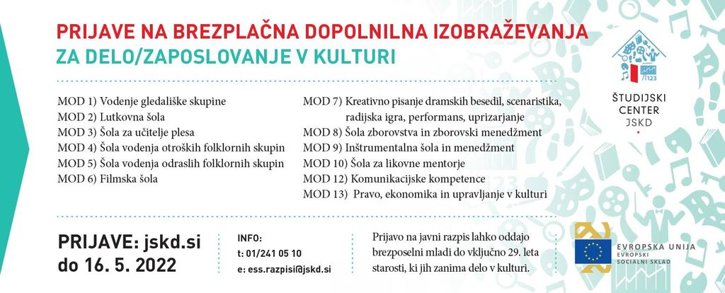 Nov prijavni rok se nanaša na: DOPOLNILNA IZOBRAŽEVANJA ZA DELO IN ZAPOSLOVANJE V KULTURI za leto 2022. JSKD nudi brezplačno izobraževanje v obsegu 120-ih ur v okviru različnih izobraževanih modulov: gledališče, lutke, ples, folklora, film, vokalna in instrumentalna glasba, likovna dejavnost, literatura, organizacija in upravljanje v kulturi ipd.). Program sofinancira Evropska unija iz Evropskega socialnega sklada (80%), preostali del sredstev pa je zagotovljen iz slovenskega proračuna.