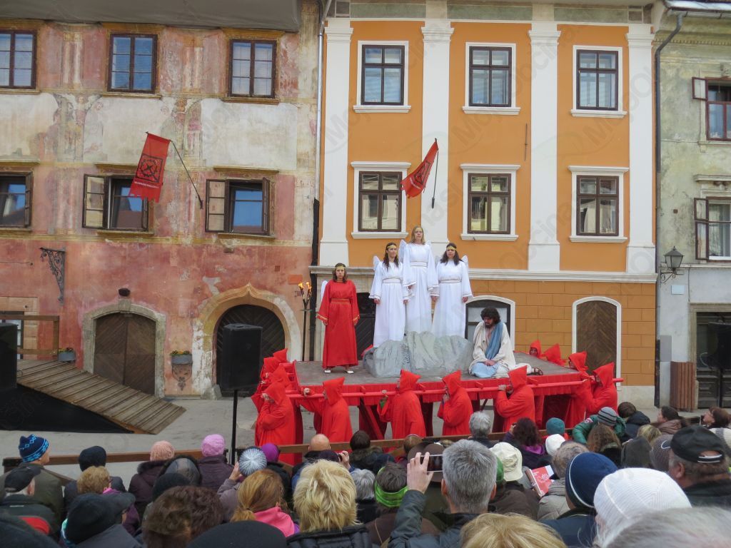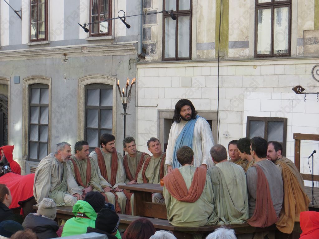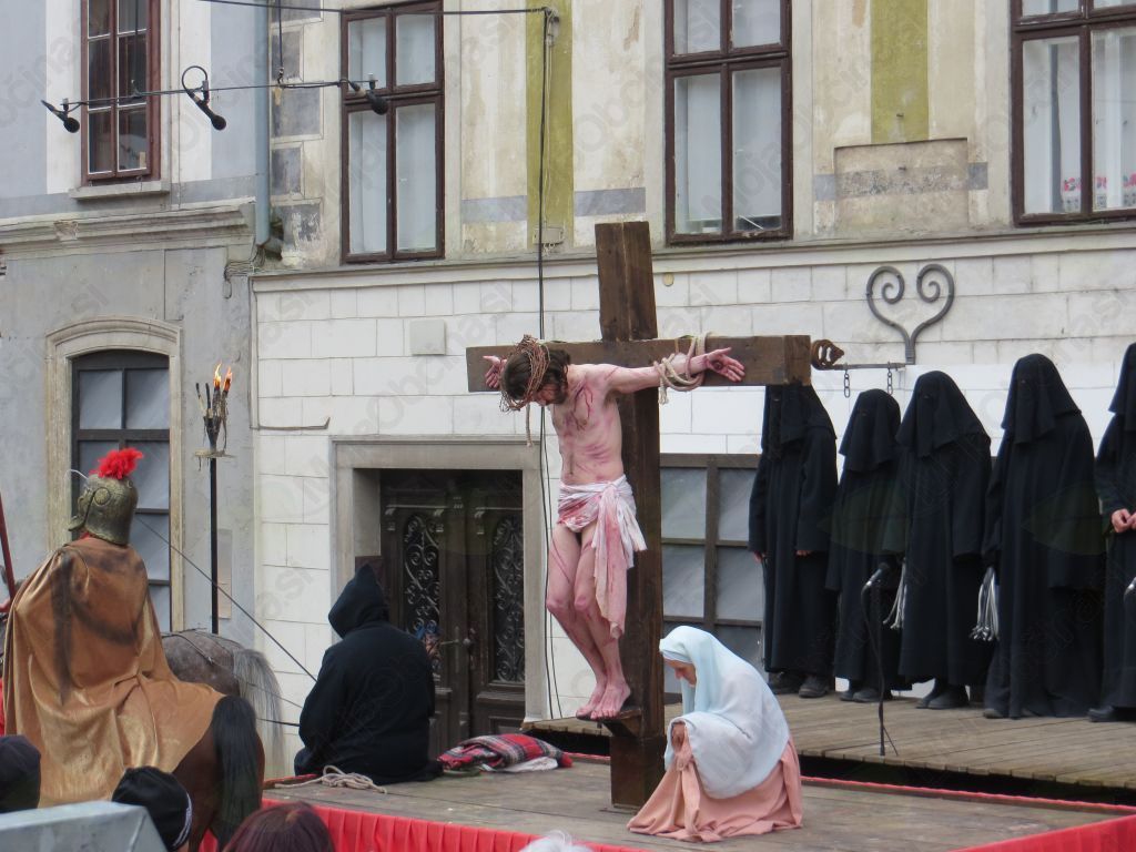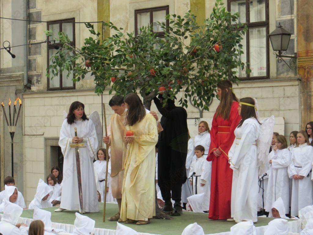 Tudi letošnji pasijon, kot že prejšnja leta, je imel štiri prizorišča – naša skupina je bila na osrednjem trgu – na Mestnem trgu. Pasijon je potekal kot procesija – to pomeni, da so se igralci ustavili pred našim odrom, odigrali svojo vlogo in nato nadaljevali svojo pot na naslednje prizorišče. Tako smo si ogledali 20 slik začenši z izgonom Adama in Eve iz raja. Vseh nastopajočih je bilo okrog 900, še 200 članov pa je skrbelo za druga potrebna dela, ki jih zahteva tako velika uprizoritev. Celotna igra je trajala dve uri.