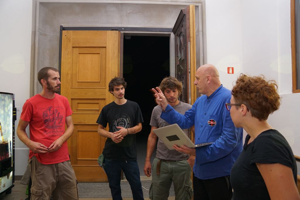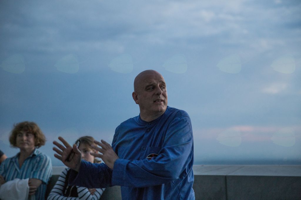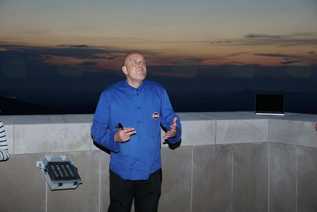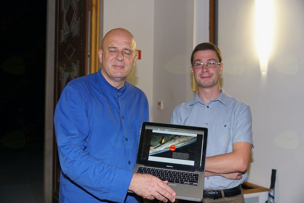 Herman Potočnik ni bil navdih samo za pionirje astronavtike, ampak tudi za umetnost in kulturo. Zato smo letos povabili igralca in gledališkega režiserja Dragana Živadinova, ki Potočnikove ideje povezuje z umetnostjo. Po glasbenem premoru dueta violinistke Sare Gorkič in kitarista Jureta Maliča, je Živadinov s svojim performativnim nastopom razgibal večer. Iz tesne dvorane nas je popeljal na teraso spomenika, pod večerno nebo, ki je postajalo vse bolj jasno. V njegovem značilnem slogu, lahko ga opišemo kot preplet predavanja, teatra in umetniškega performansa, nam je predstavil svoje delo, ki povezuje umetnost in znanost ter jemlje navdih pri Hermanu Potočniku. Skupaj z likovno umetnico Dunjo Zupančič je osnoval gledališko predstavo Noordung, ki traja 50 let in ima po eno samo ponovitev vsakih 10 let. Prvič so jo izvedli leta 1995 zadnjič pa jo bodo odigrali leta 2045. V njej nastopa 7 igralk in 7 igralcev; če bo v tem času kateri izmed teh umrl, ga bo zamenjal daljinsko voden znak. Igralke bo na odru nadomestila melodija, igralce pa ritem. Leta 2045 bo v scenskem prostoru le še 14 znakov, ostal bo skupek melodije in ritma, torej glasba. Za vsakega igralca bodo po njegovi smrti izdelali satelit, ki bo nosil vse informacije o tem človeku in vseh 14 bo nato postavljenih v geostacionarno orbito okrog Zemlje. Prvo preminulo igralko Mileno Grm je nadomestil umbot, njen umetniški satelit, ki si ga je sama izbrala, njegovo delovanje pa bodo preizkusili na Mednarodni vesoljski postaji.