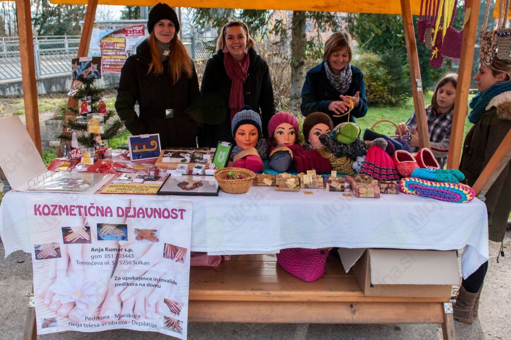 Na sosednji stojnici so svoje izdelke ponujale kar tri gospe. Anja Kumar bo v Solkanu tudi odprla svoj kozmetični salon. Ta dan pa je obiskovalcem pokazala zlasti imenitne čipke in nekaj kozmetike. Poleg nje je Katja Pregelj pokazala doma izdelano milo - žajfo. To je tako milo, ki nima umetnih kemičnih dodatkov in je narejeno iz visoko kvalitetnih surovin. Kosi žajfe so različnih barv in vonjev ter mikavno darilno zaviti. Tretja gospa, Nadja Kos, je na pult razstavila ročno pletene in kvačkane torbice in copate. So pisanih  in živahnih barv, da človeku kar srce zaigra ob pogledu nanje.