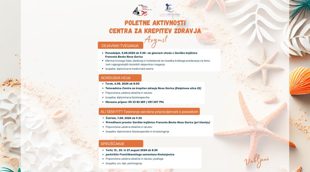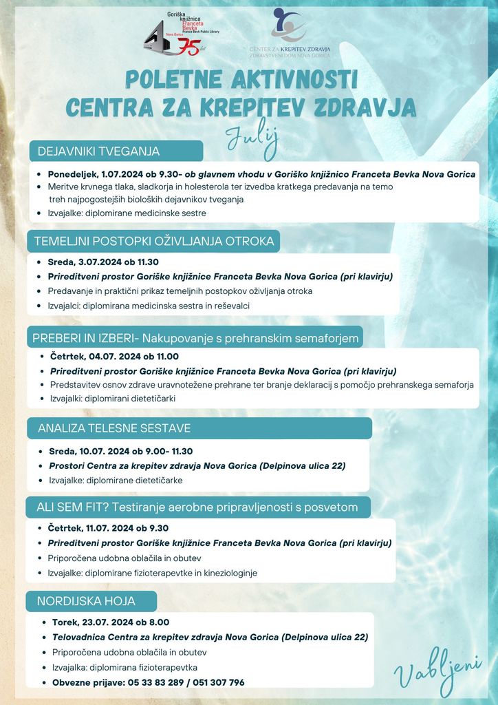 Na dogodkih, ki se bodo zvrstili v Goriški knjižnici Franceta Bevka Nova Gorica kot tudi v prostorih Centra za krepitev zdravja (nad Trgovsko hišo) bodo obiskovalcem v mesecu juliju na voljonaslednje aktivnosti: