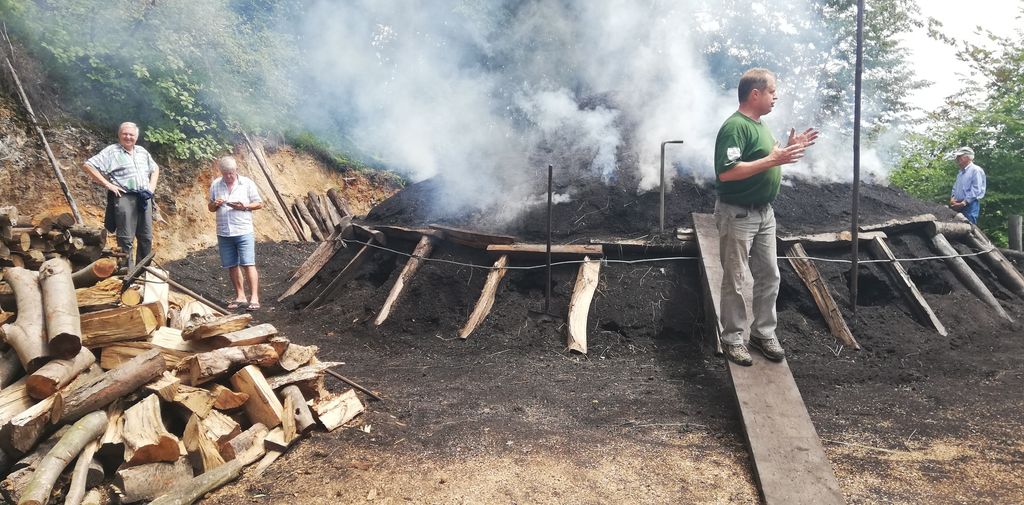 Od tu smo se po ozkih poteh podali še na oglarsko domačijo Brinovec v Slavino – Dole pri Litiji, kjer nas je sprejel gospodar Miroslav Brinovec s celotno družino. Najprej nam je ob kopi, ki gori že skoraj dva tedna, obrazložil kako poteka priprava oglarjenja. V kopo je potrebno naložiti približno 70 m3 drvi – meterc in jih primerno zložiti. Na sredini mora biti narejen kot nek dimnik, ki je pokrit z železnim pokrovom. Drva so obložena s svežo travo in pokrita s približno 20 cm slojem zemlje. Naokrog, po sredini kope je narejena pot, po kateri se da hoditi in ustvarjati dodatne zračnike. Kopo zakuri vedno ženska in gori približno tri tedne preden drva zoglenijo – ne smejo zagoreti.
