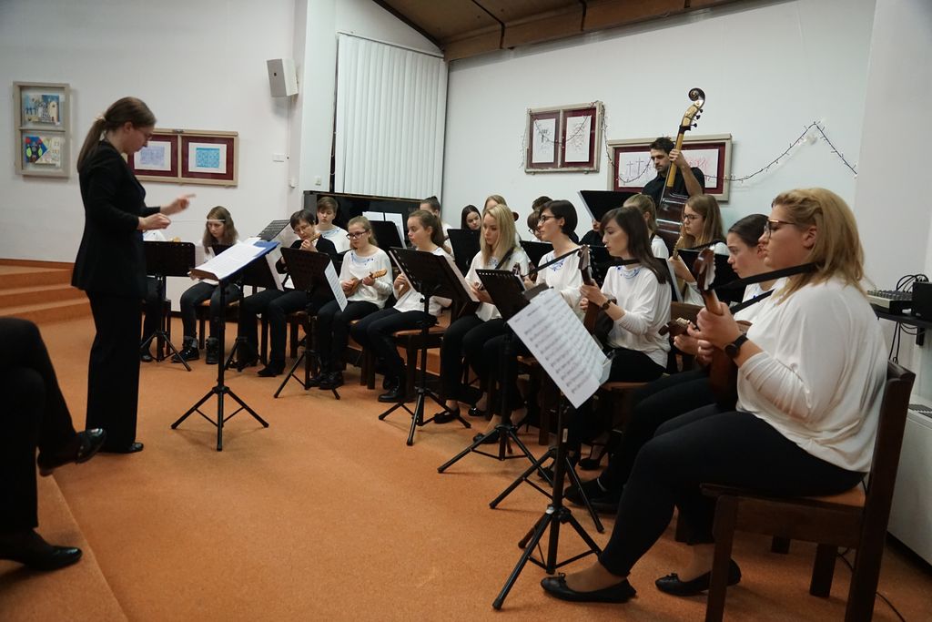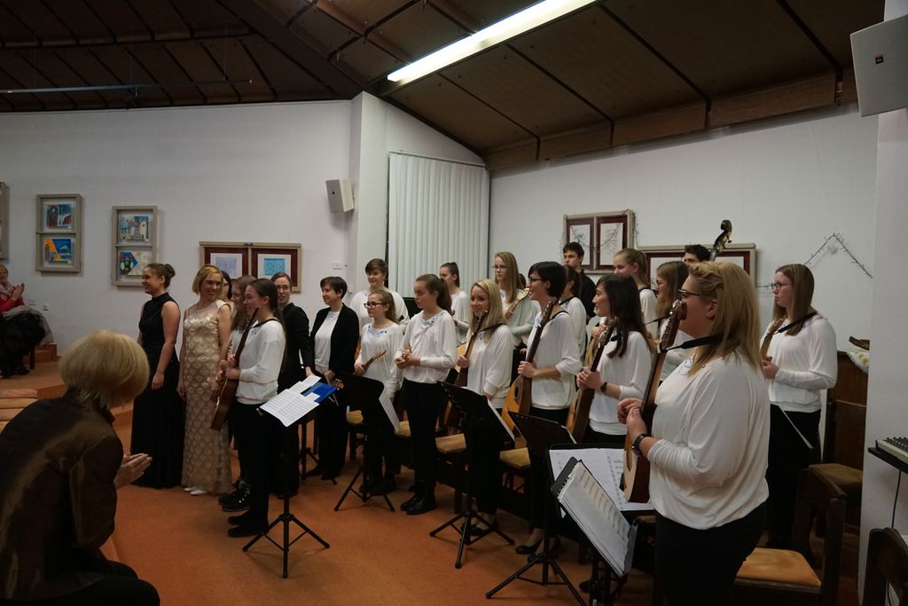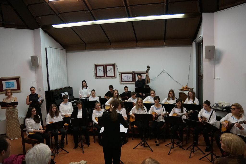 Naši  gostje so bili Tamburjaši iz Vipave. Njihovo ime vključuje pokrajinsko značilnost – burjo. Združeno sta nastopili mlajša in mladinska skupina. Mlade tamburaše, od osnovnošolcev do študentov, združuje veselje do glasbe in skupnega muziciranja. Udeležujejo se tamburaških srečanj in tekmovanj na regijski, državni in mednarodni ravni, kjer se lahko pohvalijo z izključno zlatimi priznanji.. Leta 2014 so izdali svojo prvo zgoščenko z naslovom Na strunah srca. Skupino je ustanovila in jo organizacijsko vodi mag. Vlasta Lokar Lavrenčič, umetniško vodstvo pa je v rokah akademske  glasbenice, dirigentke, Mojce Lavrenčič. Na Akademiji za glasbo v Ljubljani je študirala orkestralno dirigiranje pri prof. Marku Letonji in leta 2018 z odliko magistrirala. Med drugim je prejemnica študentske Prešernove nagrade. Kot svobodna kulturna delavka sodeluje z različnimi slovenskimi orkestri, največ pa z SNG opera in balet v Ljubljani kot korepetitorica, asistentka dirigenta in dirigentka. Božično novoletni koncertni  program sta na tamburicah solo popestrili  Mateja Lavrenčič in Nika Furlan. Publiko ,ki je napolnila dvorano do zadnjega sedeža pa sta navdušili sopranistka Polona Kante Pavlin in mezzosopranistka Anja Šinigoj. Obe pojeta v zboru SNG opera in balet Ljubljana. S profesionalno izvedenimi skladbami za glas solo  sta pričarali nepozabno božično vzdušje in prazničen uvod v leto, ki prihaja. Po  zahvali in voščilu predsednice društva Sonje Cijan pa so Tamburjaši v sproščenemu, prijetnemu vzdušju zaključili koncert s koračnico Radetski marš.