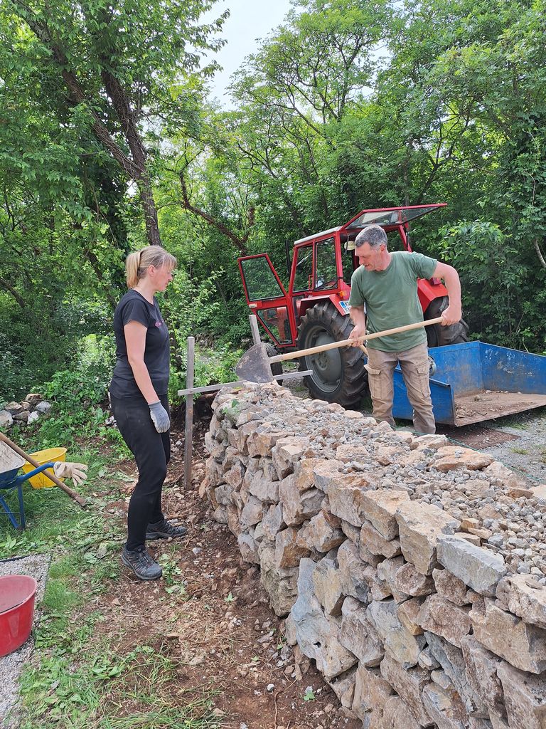 7 suhozidarjev, 4,5 kubikov kamenja, 8 ur sončnega spomladanskega vremena in obilo vztrajnosti je recept za skoraj 12 metrov novega suhozida. Zadovoljni bi bili že s polovico, ampak zagona je bilo več kot smo pričakovali. Eden od razlogov je sigurno ta, da je blizu mesec junij, ko sta na Vojščici dva pomembna dogodka. Vodila nas je želja po tem, da bo zid pred Vaškim praznikom v Kalu in Vojščičko fešto n’ mivki končan. Pa ga imamo!