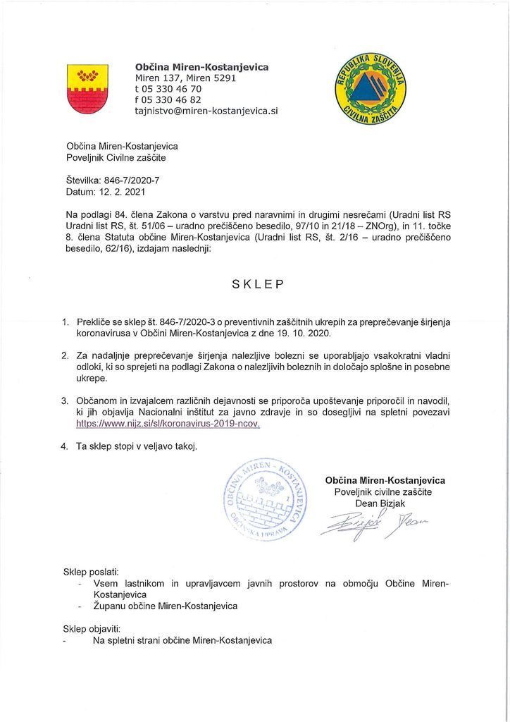 Vse lasnike in upravljavce javnih prostorov na območju Občine Miren-Kostanjevica obveščamo, da je sklep z dne 19. 10. 2020 od danes preklican.