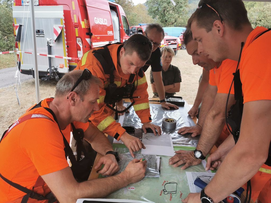 Foto intervencijski štab - prvi z leve vodja intervencije Blaž Turk - ter helikopter slovenske vojske v zraku (foto Ervin Čurlič - regijski štab CZ za severno Primorsko)