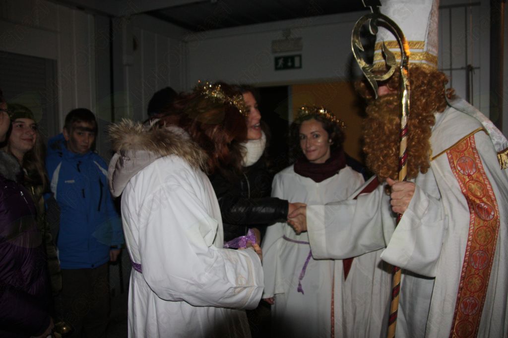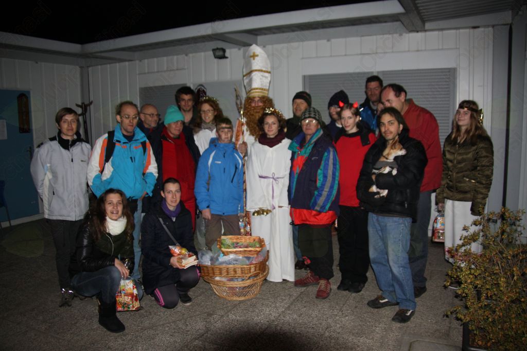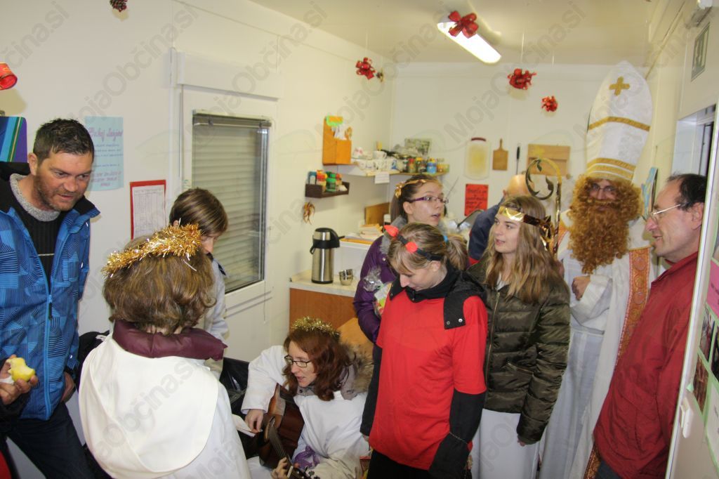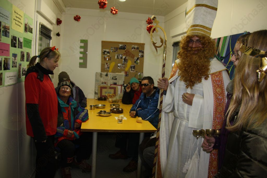Kot ponavadi smo prostovoljci razdelili večerjo in ko je bilo le te konec se je prikazal sv. Miklavž. Spremljali so ga angelčki in parkeljni. Najprej je prebral nekatera pisma, ki so jih napisali brezdomci Miklavžu. Nagovoril jih je, naj v življenju izbirajo dobro in prostovoljce je lepo pohvalil, da pridno pomagajo. Razdelil je darila, tako brezdomcem kot prostovoljcem. Pri tem so mu pomagali angelčki, parkeljni pa vsem malo nagajali. Brezdomci so bili obiska Miklavža in daril zelo veseli. Tudi prostovoljci smo se imeli lepo. Na ta večer so se nam pridružili tudi nekateri birmanci iz birmanske skupine Opatje selo. Želeli so videti kako poteka deljenje večerje v Novi Gorici in da bi tudi sami lahko en večer tudi sodelovali. Veseli smo bili, da so nam pomagali pripraviti lepo presenečenje brezdomcem.