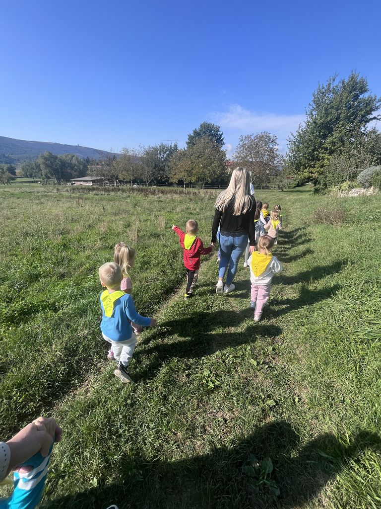 Skupaj smo se podali na prijeten sprehod, kjer so otroci z navdušenjem iskali prve znake jeseni – obarvane liste, odpadlo listje in plodove, ki so že padli z dreves.