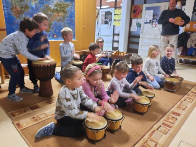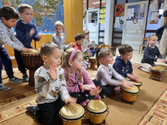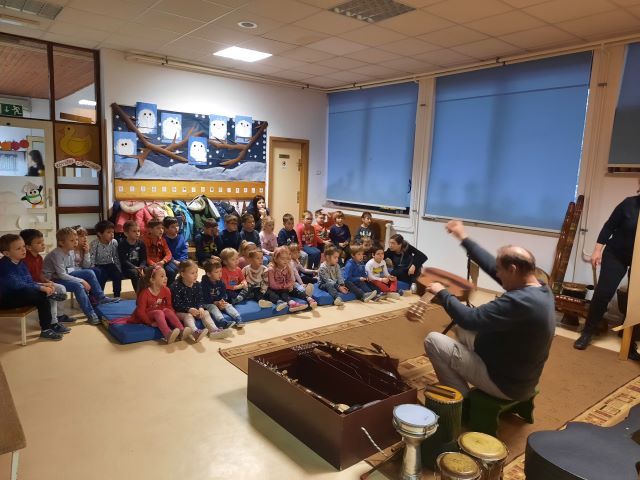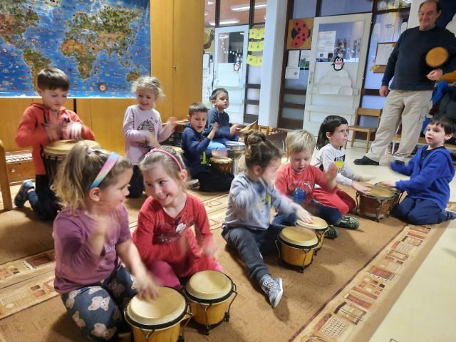Za vsak inštrument pa sta otrokom povedala, iz katerega kraja, dela sveta prihaja. Da so si otroci lažje predstavljali, sta izvor glasbila pokazala na velikem zemljevidu, nanj pa seveda tudi zaigrala. Zaključek predstavitve sta namenila otrokom in igri na bobne. Vsi otroci so preizkusili in za trenutek postali bobnarji.