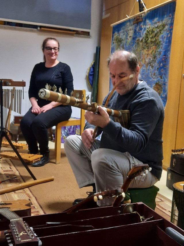 Izvajalca sta otroke s pomočjo ljudskih glasbil popeljala v svet glasbe. Otroci so spoznavali glasbila celega sveta, kot so ameriški banjo, kalimba, kraguljčki, kitara, ramanta, govoreči boben …