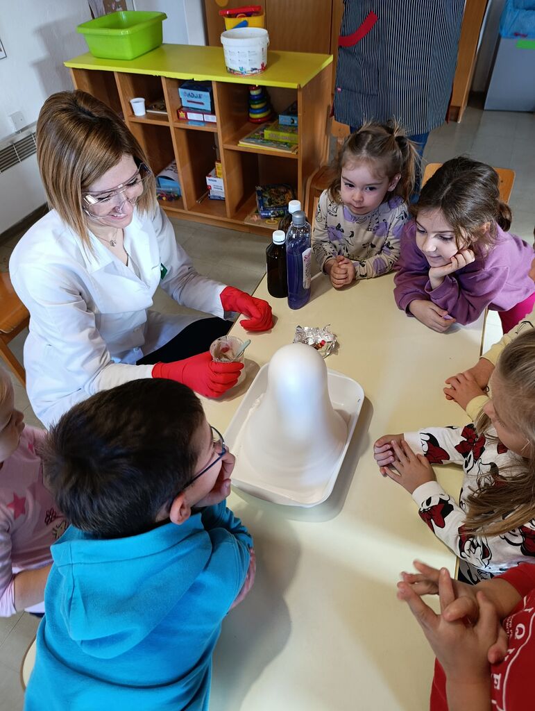 V mesecu novembru se pri MRAVLJICAH pogovarjamo o skrbi za naše zdravje. Ker imamo v igralnici na temo urejeno bolnišnico, k njej seveda spada tudi LEKARNA. V pravi lekarni opravlja poklic farmacevtke Larina mama Iva, ki nam je svoj poklic prijazno prišla predstavit v vrtec. Najprej nam je povedala, kaj farmacevti sploh počnejo – nekaj smo vedeli že sami. Potem smo vsi skupaj izdelali svojo kremo za suhe roke, ki smo jo v lončkih odnesli tudi domov. Za zaključek smo izvedli še eksperiment - VULKAN, kot se za prave farmacevte spodobi.