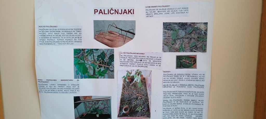 Najprej smo spoznavali značilnosti paličnjakov - njihov življenjski prostor, kaj jedo, kako je potrebno skrbeti zanje. Pomagali smo si s knjigami in internetom. Izdelali smo plakat, ki smo ga nalepili v igralnici.