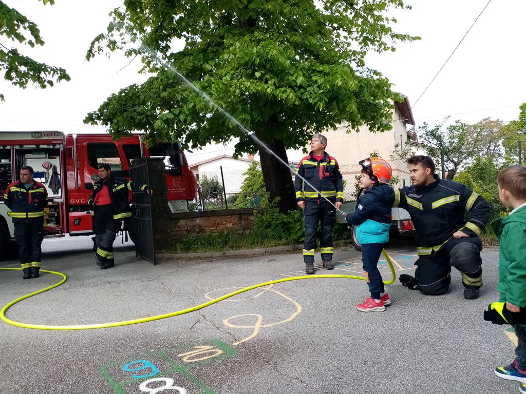 Nesreča nikoli ne počiva in prav je, da že naše najmlajše učimo, kako ukrepati v primeru, da do nje pride. Ker v vrtcu vsako učenje poteka skozi igro smo se Medvedi v Opatjem selu v petek 27. 4. igrali, da je v našem vrtcu požar. Ob zvoku sirene smo se mirno postavili v kolono in brez panike zapustili stavbo vrtca. Zbrali smo se pri tabli na igrišču, za katero otroci vedo, da označuje zbirno mesto v primeru nesreče in preverili, da smo vsi varno prispeli. Da je bila naša igra bolj resna, so nam na pomoč priskočili gasilci iz PGD Kostanjevica na Krasu. Poleg pomoči pri vaji evakuacije so otrokom prijazno razkazali svojo opremo – gasilsko tovorno vozilo in zaščitno obleko. Za zaključek so otrokom omogočili, da so se preizkusili v gašenju. Strokovne delavke se jim najlepše zahvaljujemo za doživet obisk. Prepričane smo, da bodo s pozitivnim pristopom v svoje vrste pritegnili številne mlade, ki bodo tako kot oni opravljali to pomembno poslanstvo – biti gasilec.