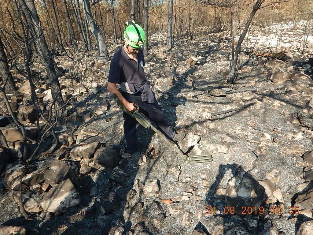 Zato je zadnji konec tedna v avgustu potekala na območju požara akcija Državne enote civilne zaščite za uničevanje neeksplodiranih ubojnih sredstev, vizuelno iskanje, detekcijo in uničenje ostalin. V dveh dneh je bilo najdenih in uničenih 52 kosov različnih neeksplodiranih ubojnih sredstev. Uničenje je potekalo z detonacijo globoko v kavernah v skrbno zavarovanem območju. Poleg samega iskanja in uničenja, ki ga je izvajalo osem članov enote CZ NUS, so pri izvajanju varovanj območja sodelovali tudi člani CZ OMK, PGD Kostanjevica na Krasu, člani enote HRI Nova Gorica ter policisti PU Nova Gorica. Skupno je v akciji delovalo 22 ljudi.