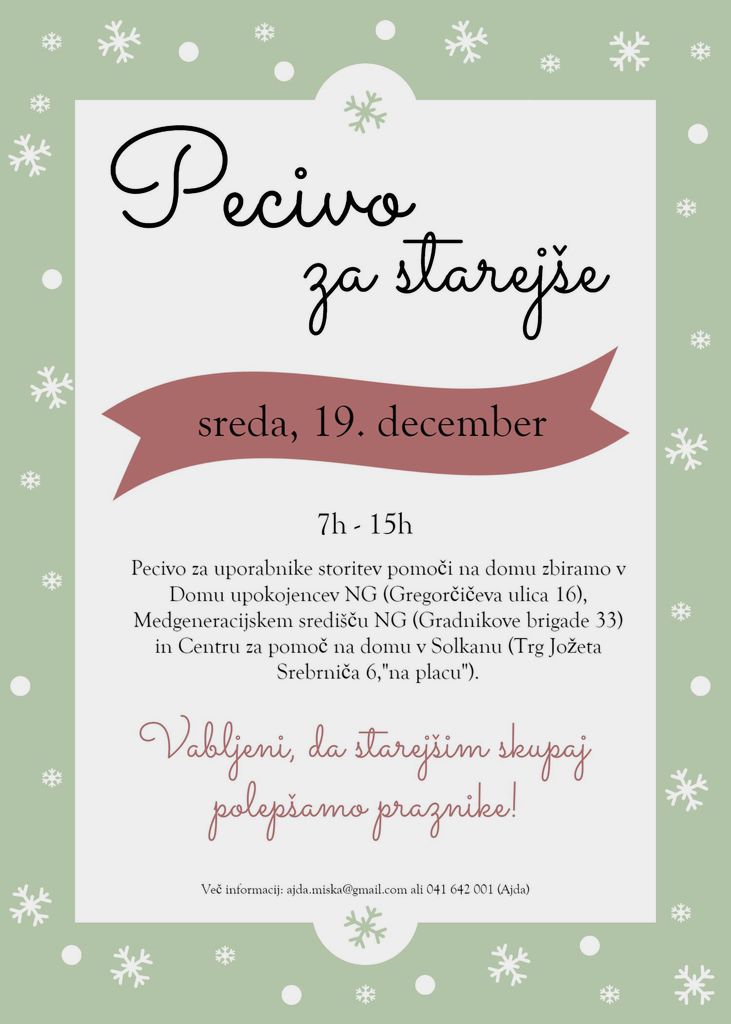 ***Priporočila: pecivo bo razdeljeno med uporabnike storitev Centra za pomoč na domu v petek, 21.12.2018, zato priporočamo, da prinašate suho pecivo, brez pokvarljivih nadevov.