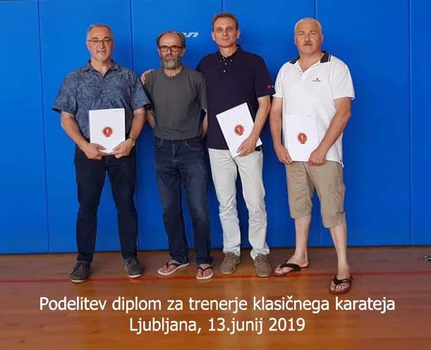 Tako so naši novi instruktorji FREDI RAVNIK (TKS ZANSHIN Portorož), MILOŠ COTIČ (TKS YOHITAKA Miren) in DORJAN FLEGO (TKS SAMURAI Koper) dne 13. junija 2019 prejeli diplome za naziv TRENER KLASIČNEGA KARATEJA.