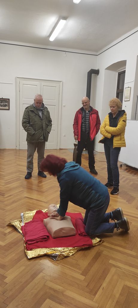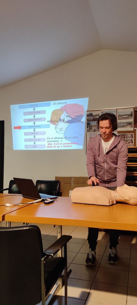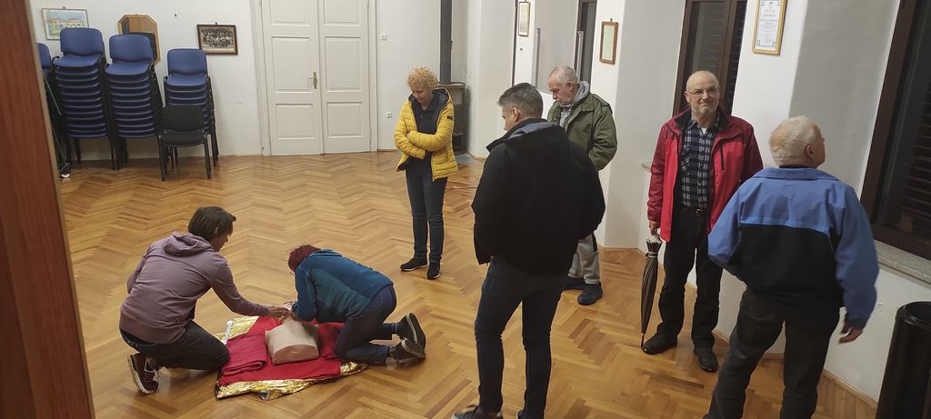 Predavanje je potekalo 27.2.2024 v prostorih bivše šole in se ga je udeležilo 10 krajanov, ki smo z zanimanjem poslušali predstavitev, sploh ker je bila podana s konkretnimi primeri, s predavateljevega delovnega mesta v bolnišnici. Čas, ki je na razpolago pri osebi, ki ne diha je zelo omejen, 3 do maksimalno 6 minut. V prvih treh minutah pomoči, so velike možnosti preživetja, zato je pomembno, da preverimo stanje bolnika ( je neodziven in ne diha), pokličemo 112 in pričnemo z oživljanjem. Če je v bližini AED- defibrilator je dobro, da ga nekdo prinese čimprej, saj se z njegovo pomočjo poveča možnost preživetja. Osebi, ki ne diha nudimo masažo srca in umetno dihanje ( 30 stisov in 2 vpiha). V kolikor si ne upamo izvajati umetno dihanje, ker osebe ne poznamo , nadaljujemo z masažo srca. Ko dobimo AED upoštevamo navodila, ki nam jih narekuje in zelo pomembno, ko pritisnemo gumb za aktivacijo, se ne sme nihče dotikati osebe, ki ji nudimo pomoč, ker se takrat sprosti električni sunek. Pomoč oživljanja nudimo dokler prizadeta oseba ne zadiha oziroma ,če se le da , dokler ne prispe ekipa PP.