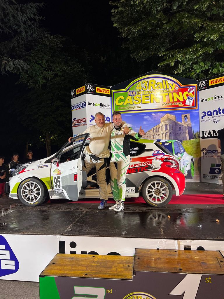 Rally del Casentino s štartom in ciljem v mestu Bibbiena vzhodno od Firenc je štel kot peta preizkušnja letošnjega regijskega pokala Mitropa in tretja italijanskega prvenstva IRC. V prvem nastopata Simon Rončel in David Kavčič (Peugeot 208 Rally4), v drugem pa Martin Čendak in Jakob Markežič (Renault Clio Rally5). 8 hitrostnih preizkušenj je bilo dolgih nekaj več kot 104 km in tekmovanje je bilo zelo zahtevno. Rončel in Kavčič sta v Toskano prišla kot vodilna posadka skupine vozil s pogonom na en par koles in tretja skupno v Mitropa pokalu. V zanju ponovno povsem novih in neznanih pogojih sta se odlično spoprijela z močno konkurenco, vozila v konstantnem ritmu in v cilj prejela zasluženo nagrado. Zasedla sta 4. mesto skupno in bila druga med vozili s pogonom na en par koles, ob tem pa velja poudariti, da sta za tretjim mestom (in avtomobilom razreda Rally2) zaostala le 10 sekund. Tako sta uspela ubraniti obe uvrstitvi in na poletni premor odhajata zadovoljna z opravljenim delom. Sicer sta se Kraševca v generalni razvrstitvi rallyja uvrstila na 41. mesto, v razredu Rally4 pa na 8.mesto. Dirko je v tem razredu začelo 19 posadk, v cilj pa jih je prispelo 15.
