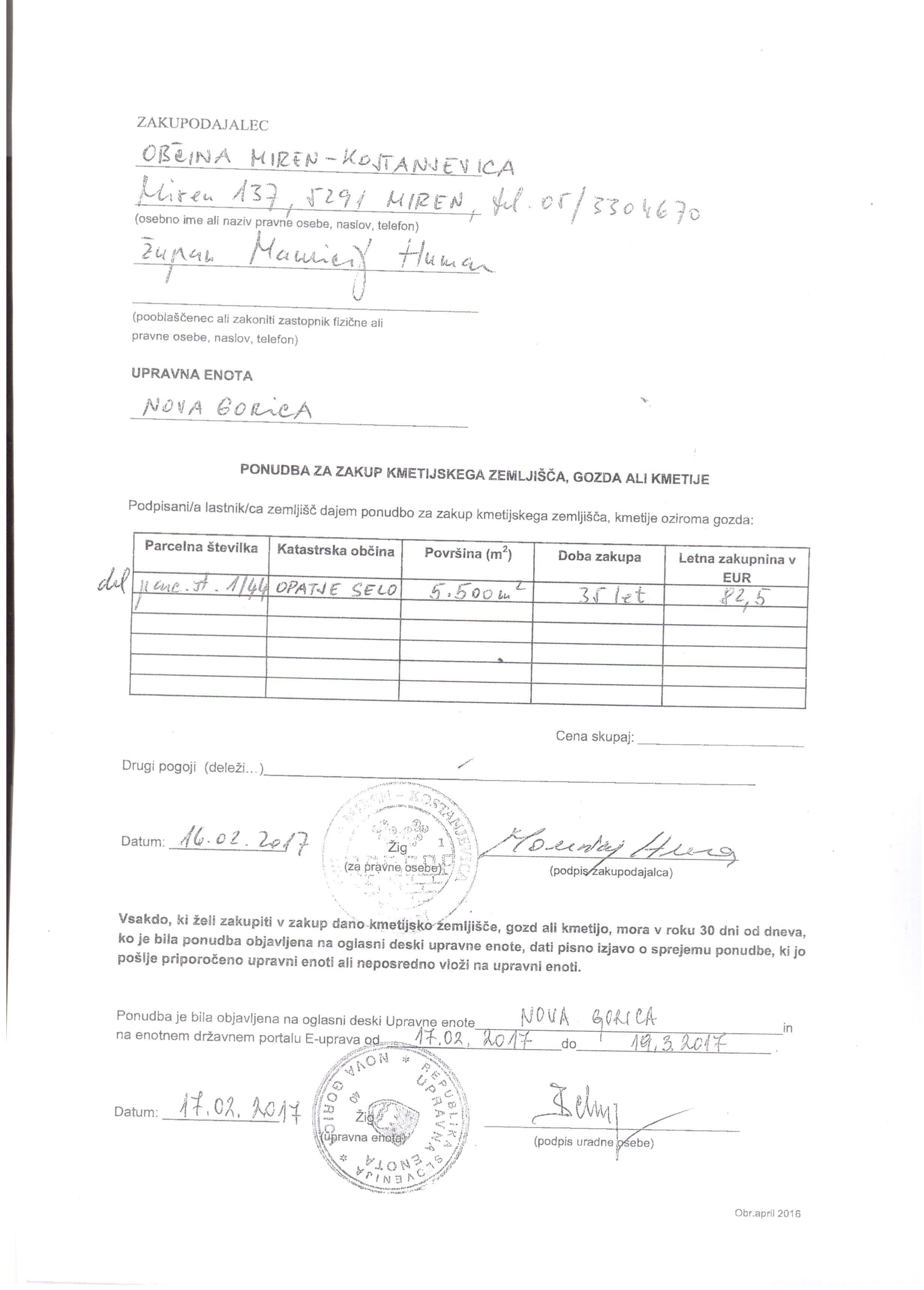 Občina Miren-Kostanjevica bo po metodi neposredne pogodbe oddala v zakup del zemljišča s parc. št. 1/44 k.o. Opatje selo v izmeri 5.500 m2.