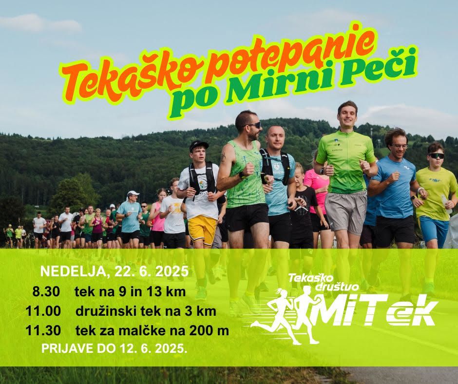 - 13-kilometrski tek – Pot je razgibana, poteka po asfaltu, makadamu in gozdni poti. Popelje nas skozi center Mirne Peči v smeri avtoceste, kjer se nadaljuje po stranskih in gozdnih poteh. V zadnjem delu tečemo mimo vasi Mali Vrh proti izhodišču, kjer je tudi cilj. Na poti bodo okrepčevalnice. Tek je primeren za vse, ki pretečejo 10 km v času do 70 minut.