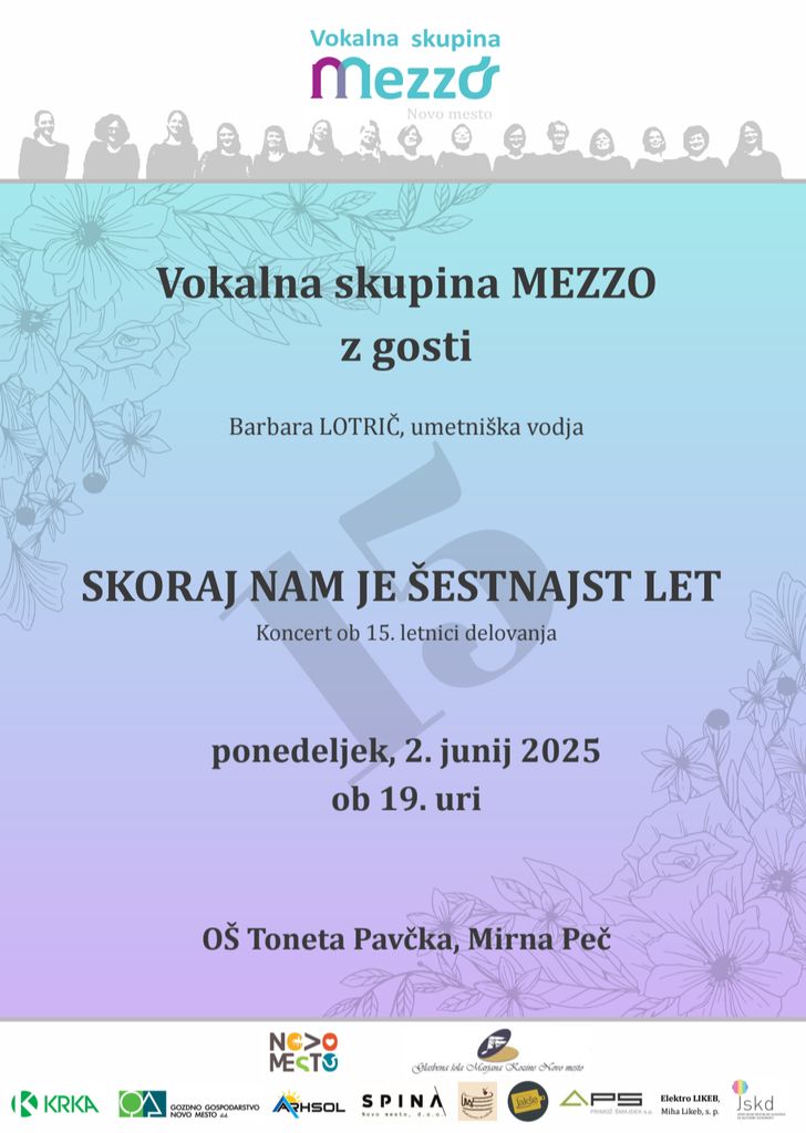 Ženska Vokalna skupina Mezzo iz Novega mesta vas 2.6.2025 ob 19. uri vljudno vabi v OŠ Toneta Pavčka v Mirni Peči na koncert ob praznovanju 15-letnice delovanja pevske zasedbe z naslovom SKORAJ NAM JE ŠESTNAJST LET.
