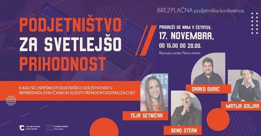 BREZPLAČNA podjetniška konferenca PODJETNIŠTVO ZA SVETLEJŠO PRIHODNOST, ki jo organizira EUROPE DIRECT Novo mesto, je pred vrati. To je odlična priložnost za vsa podjetja v vaši občini, da se nam pridružijo na dogodku, ki bo v četrtek, 17. novembra, s pričetkom ob 15. uri na Razvojnem centru Novo mesto.