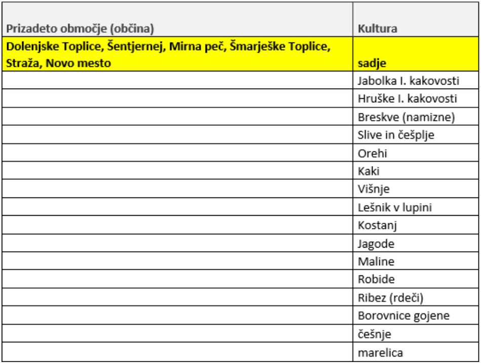 Seznam priznanih kmetijskih kultur, ki se ocenjuje v okviru škode zaradi pozebe v letu 2025:
