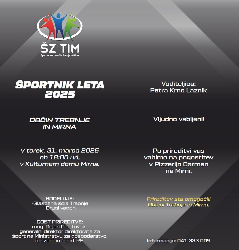 Lepo vabljeni na medobčinsko športno prireditev "Športnik leta 2025" občin Trebnje in Mirna, ki bov torek, 31. marca 2026 ob 18.uri v Kulturnem domu Mirna.