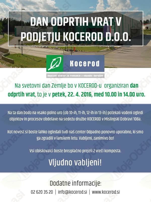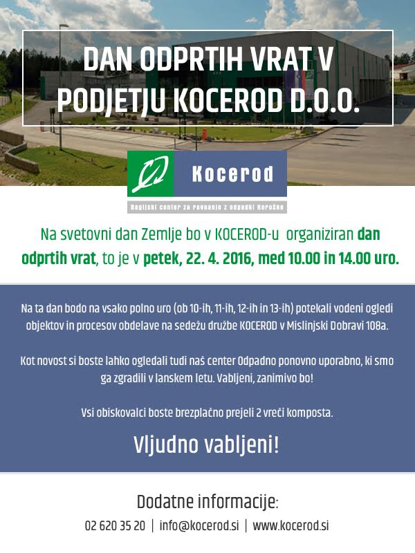 Na svetovni dan Zemlje bo v podjetju Kocerod d.o.o. organiziran dan odprtih vrat v petek 22.4.2016 med 10:00 in 14:00 uro.