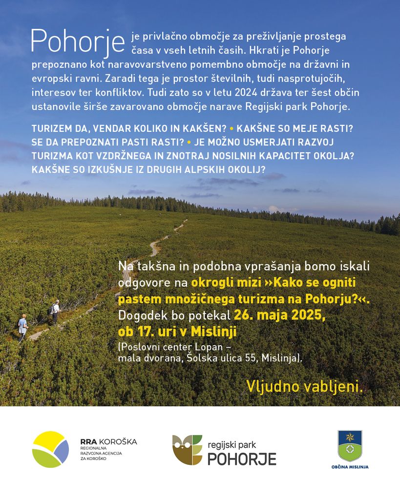 Na takšna in podobna vprašanja bomo iskali odgovore na okrogli mizi »Kako se ogniti pastem množičnega turizma na Pohorju?«. Dogodek bo potekal 26. maja 2025 ob 17. uri v Mislinji (Poslovni center Lopan – mala dvorana, Šolska ulica 55, Mislinja).