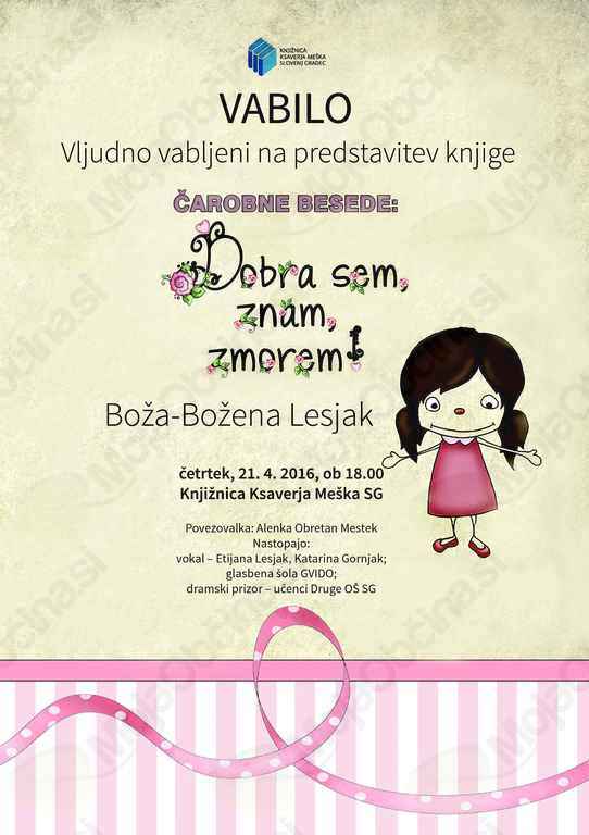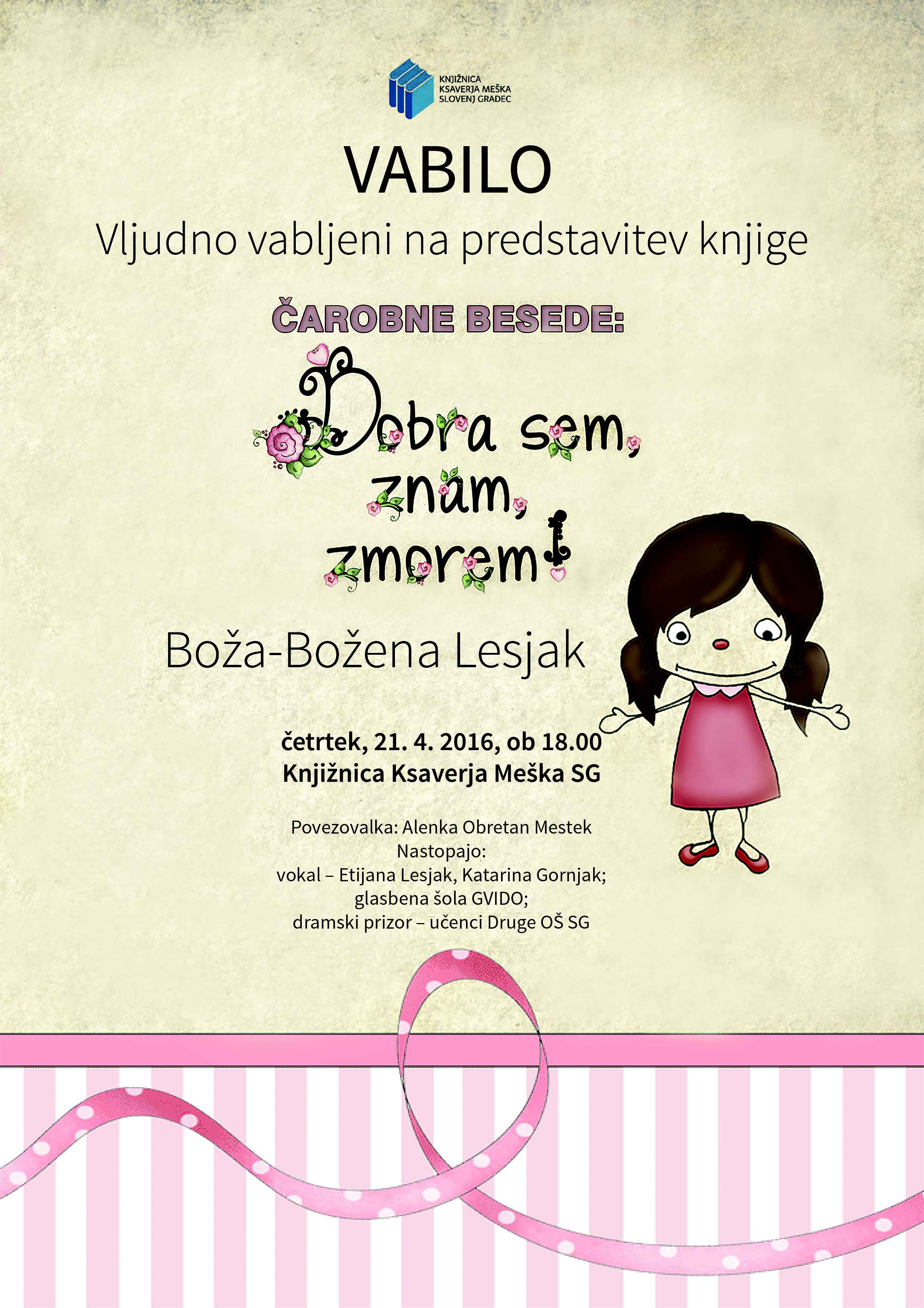 Vljudno vabljeni na predstavitev knjige "Čarobne besede: Dobra sem, znam, zmorem!" v četrtek 21.4.2016 ob 18:00 uri v knjižnici Ksaverja Meška v Slovenj Gradcu.