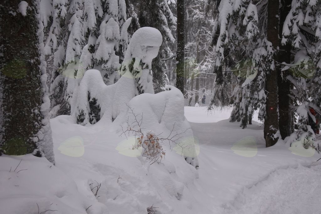 Večina pohodnikov se je po kratkem postanku na vrhu odpravila nazaj v dolino. Nekaj pogumnejših pa se nas je odpravilo še proti Ribniški koči. Pot tja in nazaj je bila kar naporna, saj se je sneg samo presipal pod nogami, a vsi napori so bili pozabljeni , ko si se ozrl po okolici, saj je narava naredila enkratne snežne skulpture na smrekah.