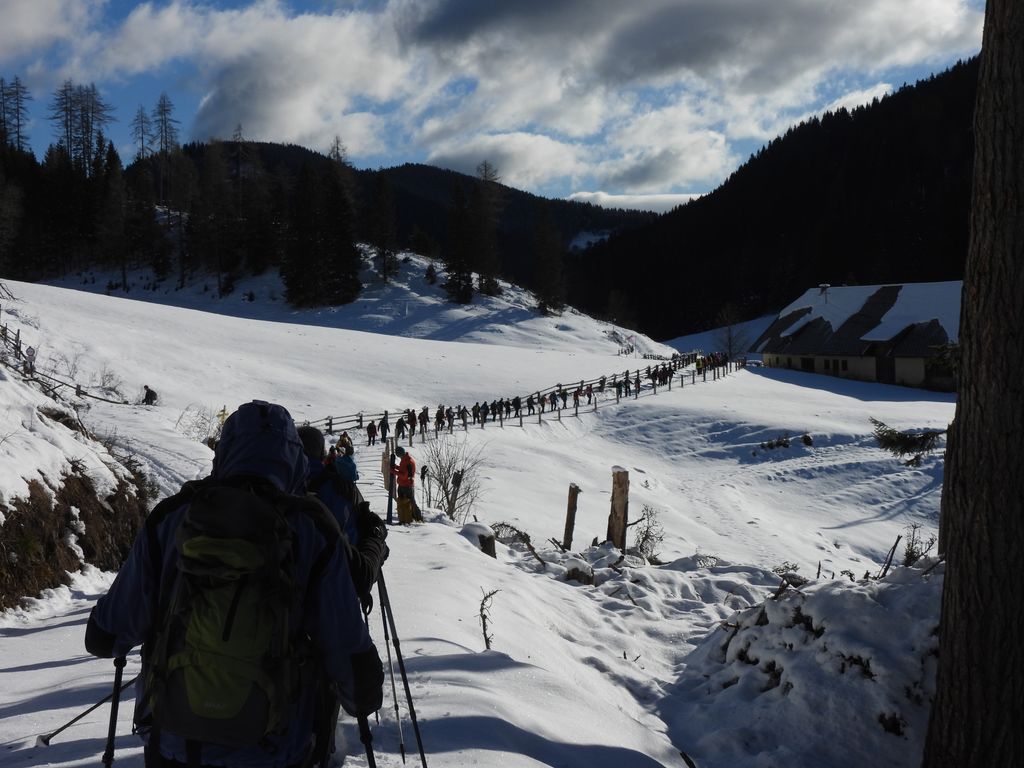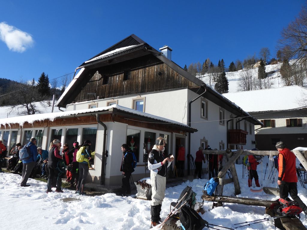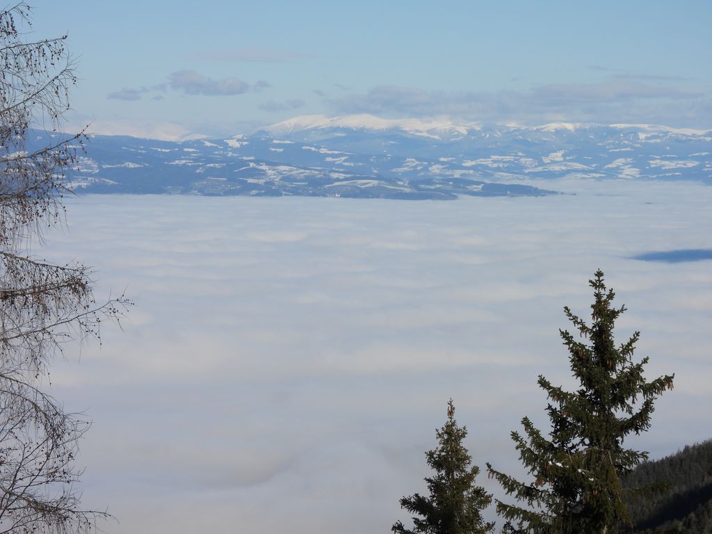 Tudi vreme nam je tokrat odlično služilo, saj se je po jutranji megli nebo razjasnilo in nas je sonce spremljalo celo pot. Lahko smo občudovali oddaljene Savinjske Alpe s Storžičem in razbrazdano Košuto, na drugi strani pa še avstrijske planine. Snega je bilo ravno toliko, da smo lahko občudovali njegovo belino in iskrice, ki so jih ustvarili sončni žarki. Še bolj intenziven kontrast pa je ustvarilo temno modro nebo nad nami.