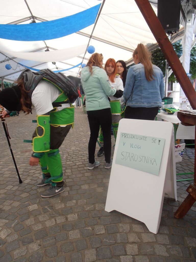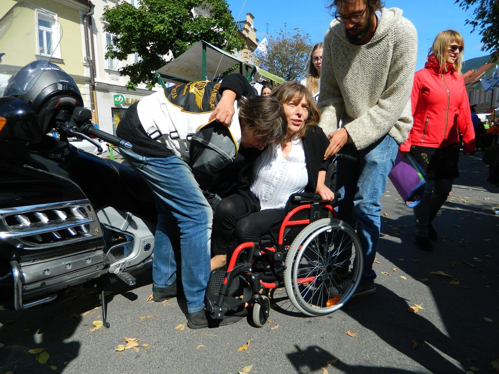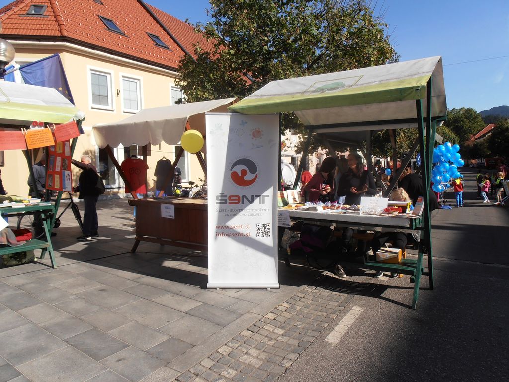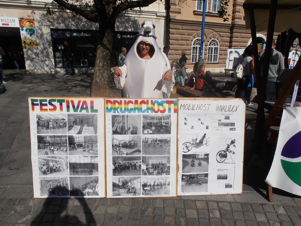 Na sončen petek 20.9. smo se družili v mestnem jedru Slovenj Gradca, kjer je potekal že 21. Mirovniški festival in tudi Bazar 12. Festival drugačnosti, s katerima smo ponovno obeležili Svetovni dan miru pod skupnim naslovom Leto avtohtonih jezikov zaznamuje slogan Pogovarjaj se z mano. To leto z izrednim številom stojnic so se predstavile nevladne in humanitarne organizacije iz cele Slovenije, organizacije in društva, ki združujejo ljudi s posebnimi potrebami ter koroške šole. Pester je bil tudi spremljevalni program z zanimivimi zabavno-ustvarjalnimi in poučnimi delavnicami: potekala je delavnica besednih iger, pozdravi in vislice v tujih jezikih, poslikava obraza, npr. Center eksperimentiranja je pripravil delavnice na temo letalstva, svetlobe in eksperimentiranja… društva invalidov so: prikazali gibanje gibalno oviranih, gibanje slepih in slabovidnih, simulacijo raznih »slabih vidov«, prikaz “kretanja” – sporazumevanja gluhih in naglušnih, merili so pritisk sladkor v krvi, predstavili svoje video filme, … Posebna je bila delavnica simulacije Centra za krepitev zdravja Koroške, s katero smo lahko vstopili v “čevlje” starostnika. Plezalni stolp, kjer so varovanje izvajali člani Alpinističnega kluba Slovenj Gradec je preizkusilo mnogo obiskovalcev, a namenjen je bil predstavitvi paraplezalstva, katerega je izvedla Prevaljčanka Tanja Glušič, slepa in gluha paraplezalka, dobitnica vrste medalj z svetovnih prvenstev - njen trener je Jurij Ravnik. Humanitarni Zavod Beli angeli je na motorju popeljal invalide, na košarkarski tekmi pa so se pomerili člani Društva paraplegikov Koroške in ekipe župana MOSG. Na odru (in pred njim) so se vrstili nastopi šol in različnih društev. Dom starostnikov in VVZ SG so nam predstavili Kogojev pohod (“Sprehod za spomin” ob svetovnem dnevu Alzheimerjeve bolezni). Vzgojno varstveni zavod je predstavil tri pesmice in deklamacijo, dve skladbi pa so nam zapeli člani pevskega zbora Veseljaki iz CUDV Črna. Zdravstveni dom je predstavil vadbo primerno za invalide na vozičkih, starejše in zaposlene, ki dosti sedijo. Nastopile so ljudske pevke Lastovke iz Društva invalidov. Potekala je tudi predstavitev projekta in zgodba za starejše “Starejši za starejše za višjo kakovost življenja doma”. Odbor za planinstvo invalidov Planinske zveze Slovenije je predstavil svoje akcije, tudi pravkar uspešno zaključeno »Gluhi strežejo na kočah« - izvedla gluha para atletinja Maja Kuzma ob pomoči prevajalke Teje Brulc. V nagradnem kvizu je društvo YHD spraševalo o pravilnem pristopu k hendikepirani osebi. Glasbeni gost pa je bil sedaj popularni slovenski raper in izvajalec hip hop glasbe Nipke. Pred in po nastopu si je z veliko mere potrpežljivosti vzel čas za vsakogar in delil avtograme. Balon z željami se je ob bučnem vzpodbujanju in plosku povzpel v zrak – in ta cel živ-žav, polni informacij, delavnic, nastopov se vrne drugo leto.