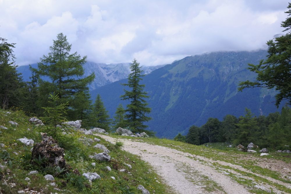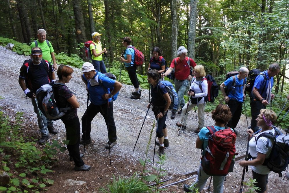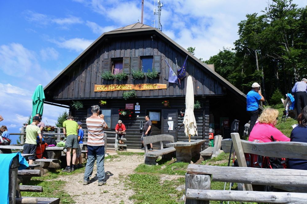 Na koncu vasice Hudi graben smo izstopili iz kombijev in se peš napotili proti Koči na Dobrči. Do koče smo se vzpenjali izmenično nekaj časa po kolovozu in nekaj časa po gozdni stezi. Po dobri uri hoje smo prispeli na razpotje, kjer se nam je z leve strani priključila pot iz Begunj. Od razpotja smo do koče hodili še uro in pol po strmi gozdni stezi. Pri koči smo si privoščili daljši počitek.