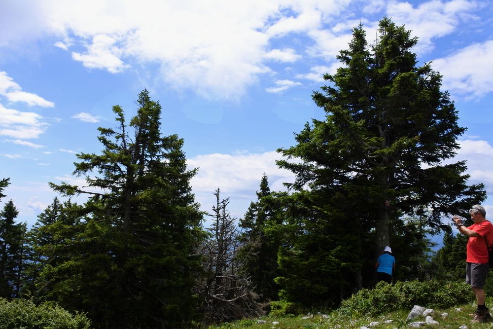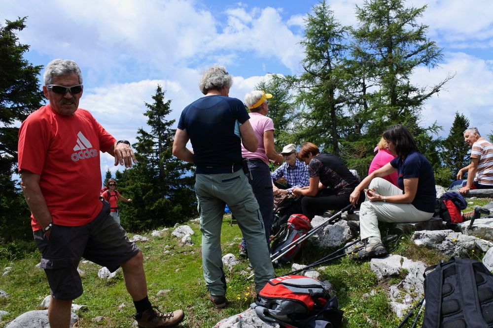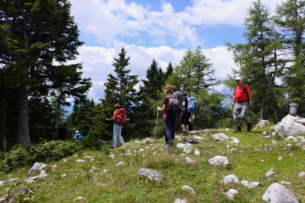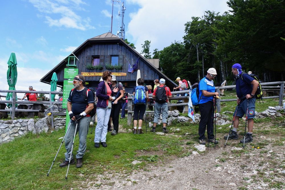Pred odhodom na vrh Dobrče smo naredili še skupinsko fotografijo. Pot na vrh je speljana mimo planšarije. Sprva se razleze po razglednem travniku, pozneje pa zavije v redek gozd, skozi katerega smo se povzpeli do vrha. Na vrhu se nas je večina odločila za sprehod do sosednjega razglednega vrha z imenom Šentanski vrh (1635 m).