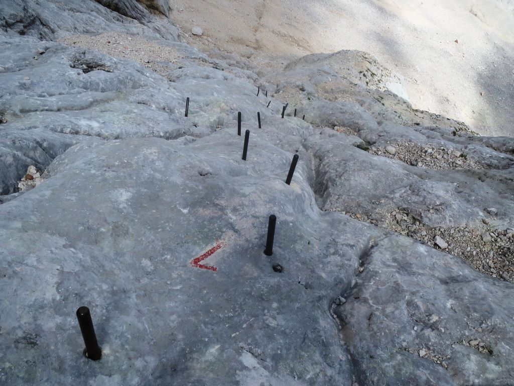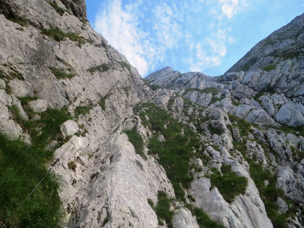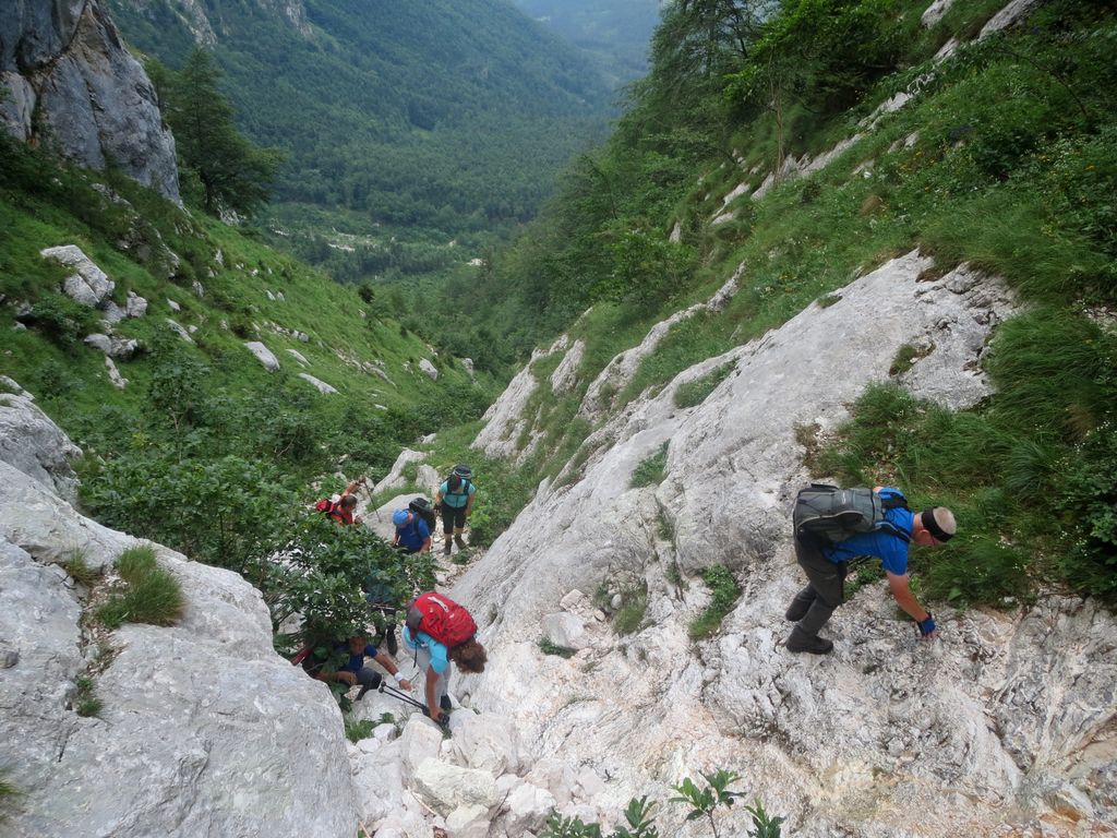 Veselih obrazov in v dobrem vzdušju smo po kolovozu krenili skozi gozd. Pot čez Gamsov skret je sicer neoznačena, a tokrat je bila do gozdne meje lepo urejena (posekane veje in pokošena trava) in večino poti kar dobro uhojena. Vseskozi smo se po stezi strmo vzpenjali, najprej skozi gozd, nato preko skalnega dela, zatem čez strma travnata pobočja. Izmenjaje smo prečili skalne dele, ki so bili opremljeni tudi z nekaj varovali (klini in jeklenice) ter travniška pobočja. Na vrhu enega od njih nas je pot pripeljala do klopce z napisom »Poglej in se nasmej«, kjer smo si privoščili malo daljši počitek. Z velikim pričakovanjem smo se ozirali proti Skuti, ki je bila že skoraj tako rekoč na dosegu roke.