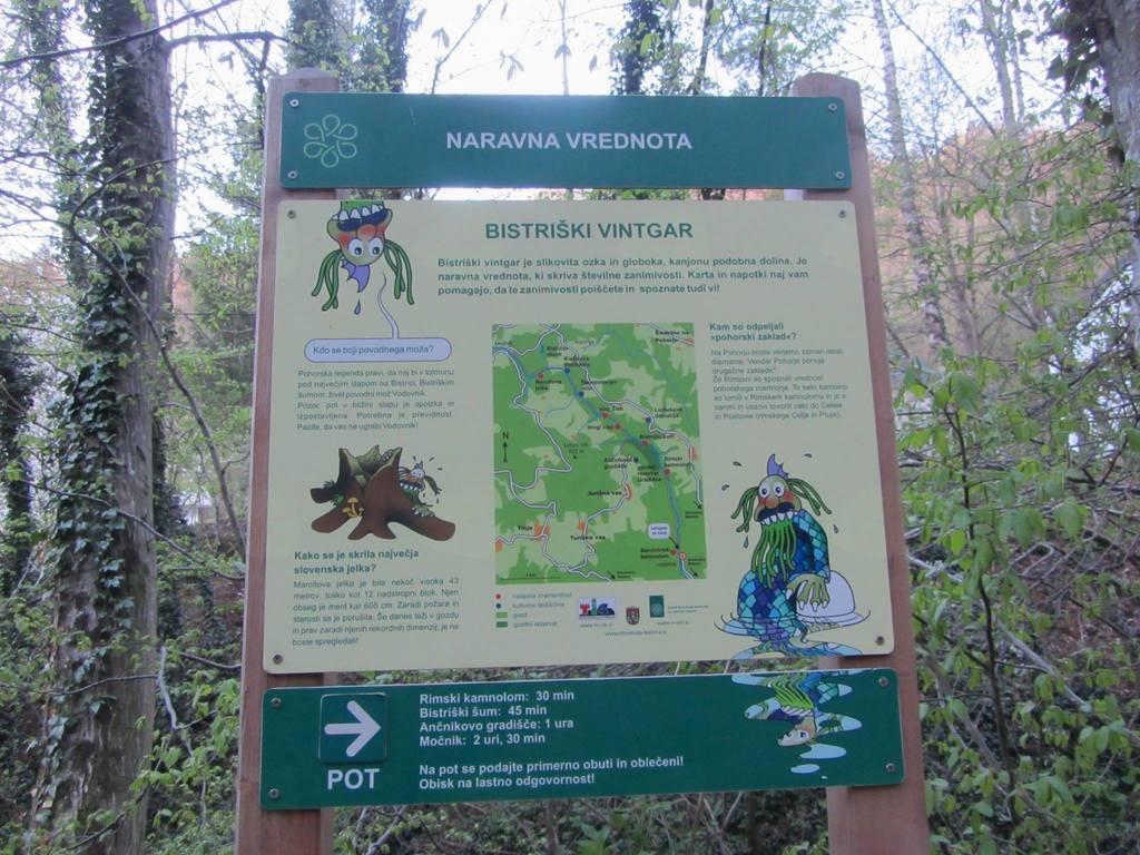 V začetku smo hodili po široki in položni poti po levem bregu Bistrice, ki smo jo kasneje prečili. Vzpenjali smo se mimo Rimskega kamnoloma, kjer so v času rimskega cesarstva pridobivali beli marmor za umetniške stvaritve. Od tu je postajala pot strmejša in struga Bistrice je bila že globoko pod nami.