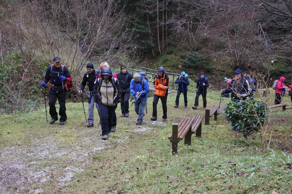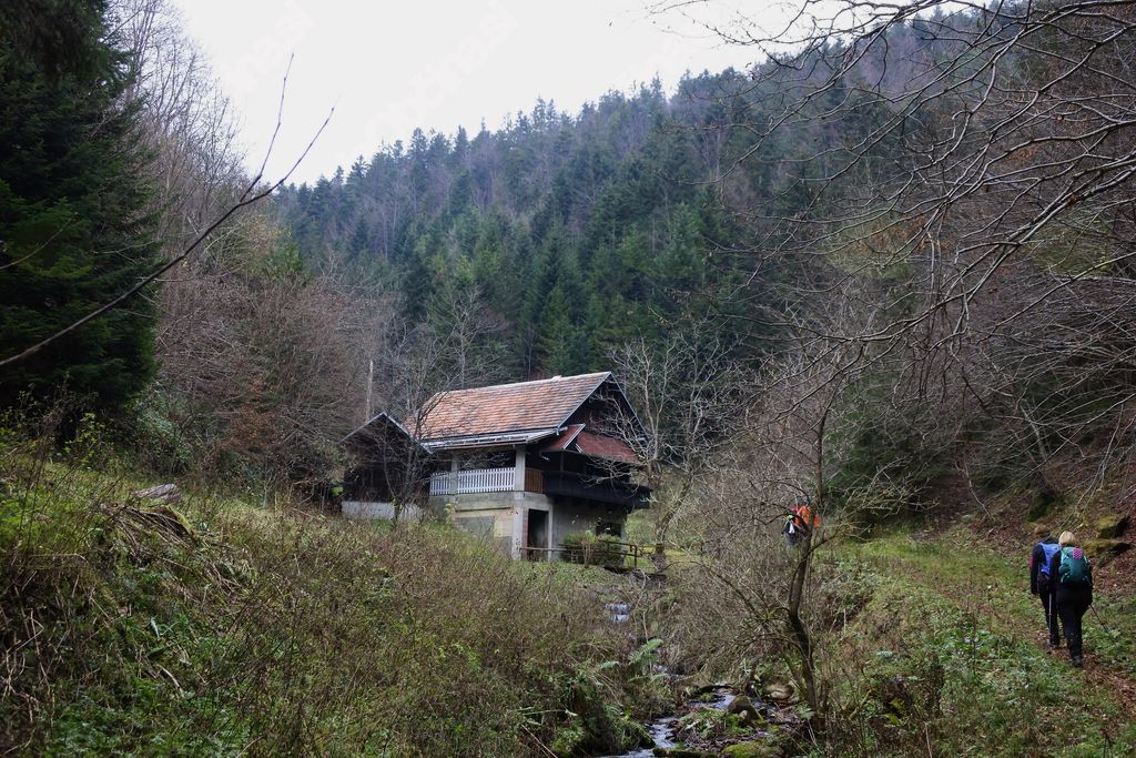 Od mlina smo pot nadaljevali po makadamski cesti mimo ribnika, ob katerem je postavljena nova lesena stavba. Med potjo od mlina proti Sv. Duhu so nas pozdravljale posamezne snežinke, tako da smo uživali v pravem zimskem vzdušju.