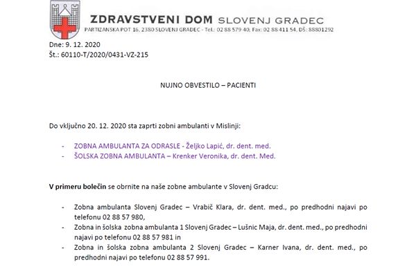 Občina Mislinja je na svoji občinski spletni strani objavila obvestilo o zaprtju zobozdravstvenih ambulant v občini. Obvestilo lahko preberete na priloženi fotografiji.