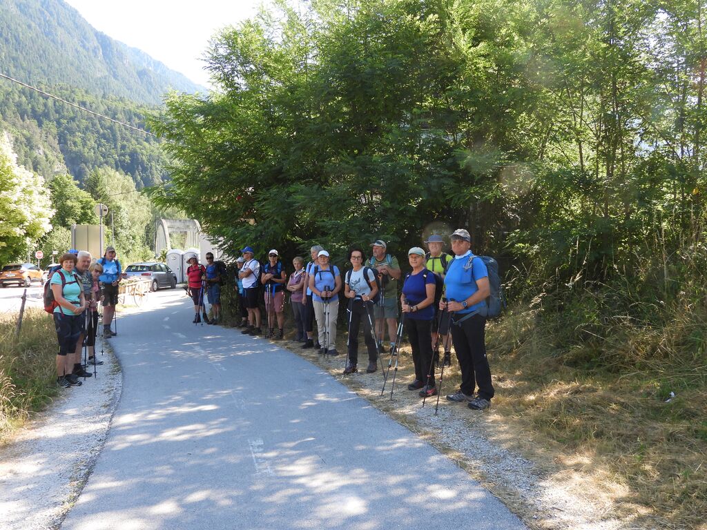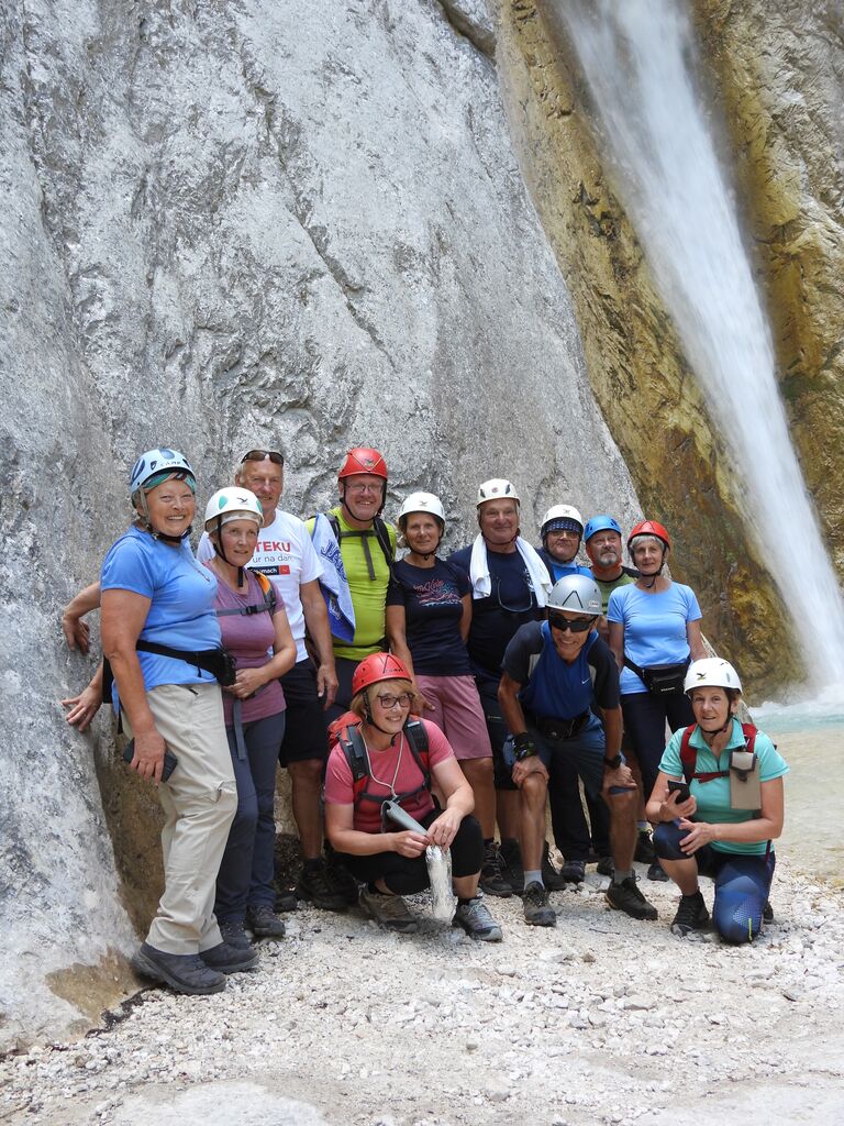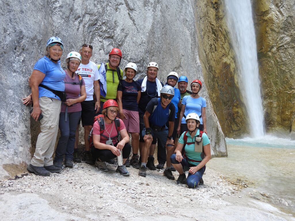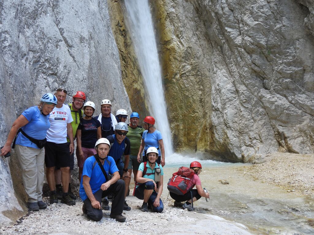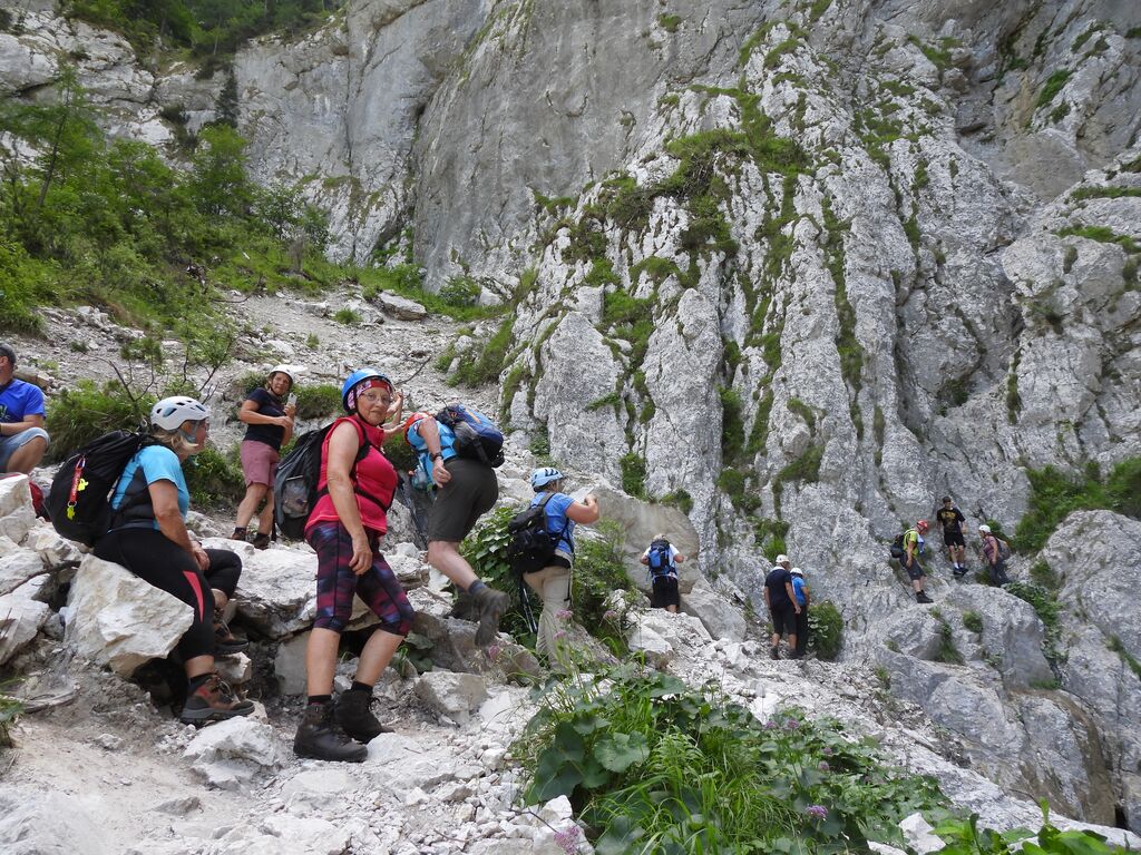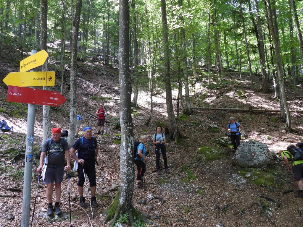 V našem izhodišču pohoda na parkirišču v Gozdu Martuljku smo po daljšem času spet preverili, ali smo opremljeni s čeladami, in pripravljeni, da kljub znanem tveganju za padanje kamenja in spolzkim odsekom poti osvojimo poglede in hlad vseh treh slapov.