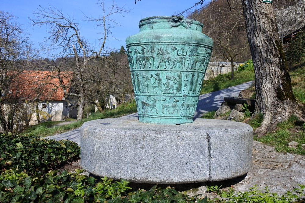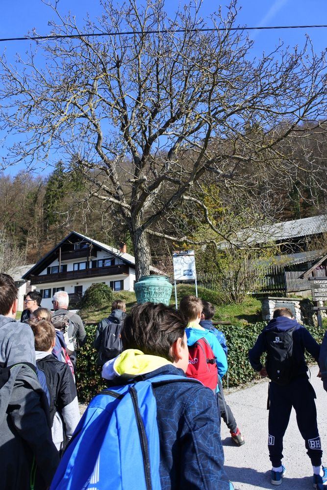 Naša pot nas je vodila po asfaltu nad vas. Prišli smo do replike situle, kjer smo si vzeli čas za počitek, slikanje in mini okrepčilo. Kasneje je pot prešla v razgibano makadamsko cesto, po kateri smo hodili malo navzgor, malo navzdol, naš cilj pa se je izmikal pogledu.