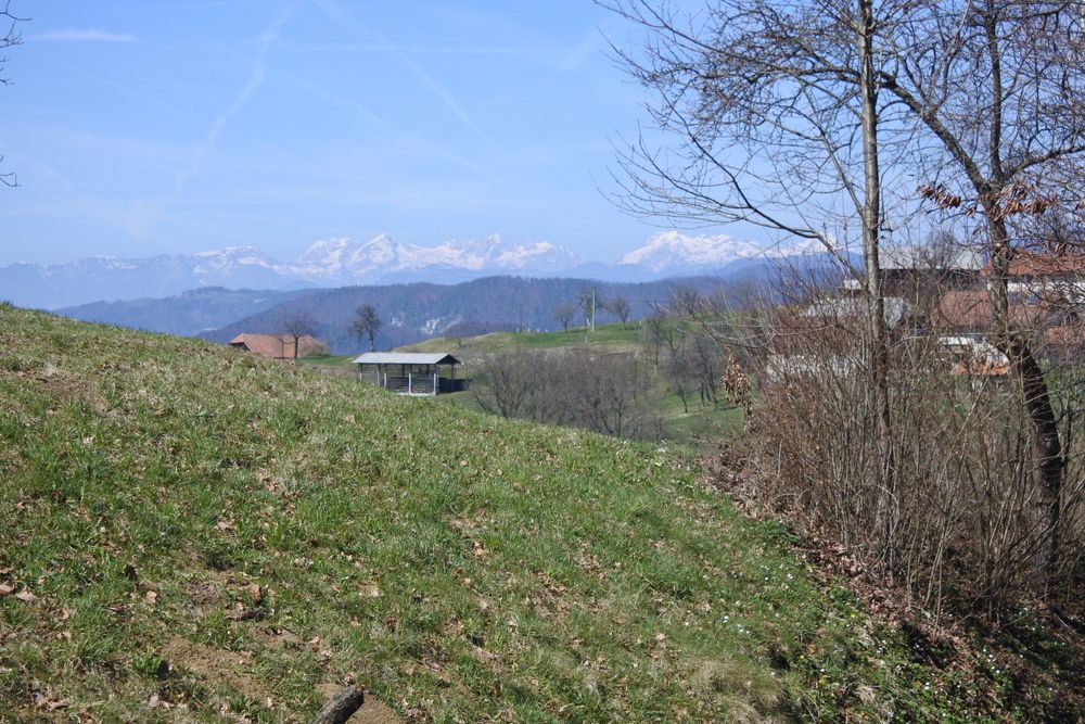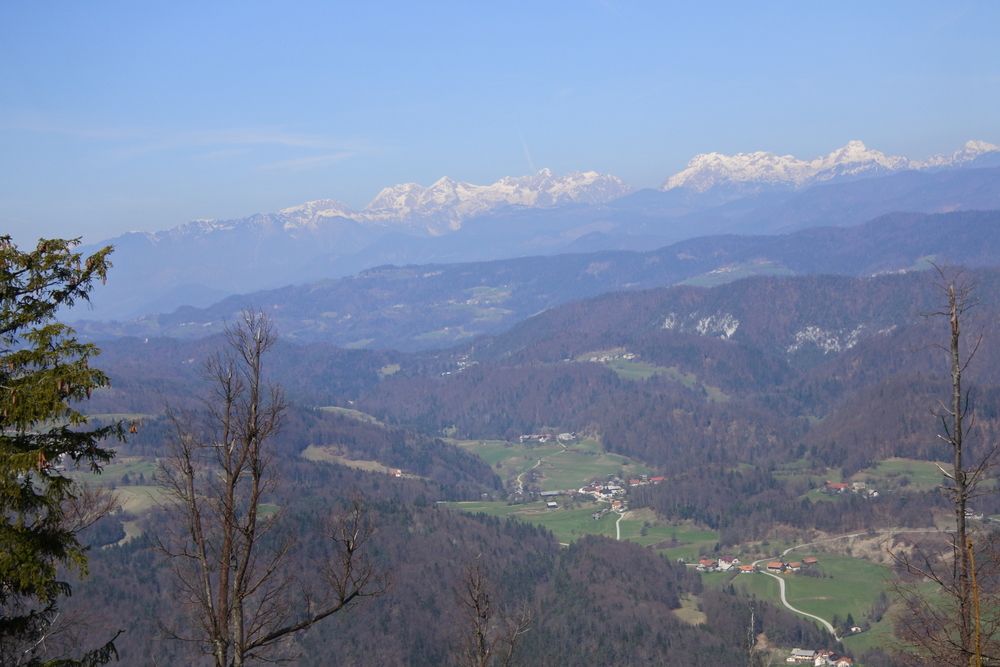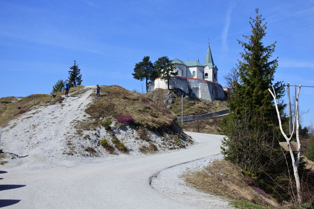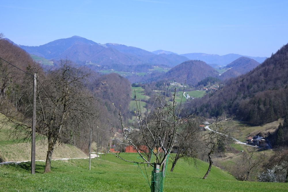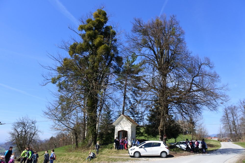 Desno nad nami se je odpiral lep pogled na cerkev, ki smo jo obhodili po krožni poti. Viri navajajo, da je tukaj že v 13. stoletju stalo pogansko svetišče, kasneje pa so na tem mestu 1753 leta sezidali to romarsko Marijino cerkev. Na vse strani so se nam odpirali pogledi na bližja pobočja, v daljavi pa na Kamniško-Savinjske Alpe.