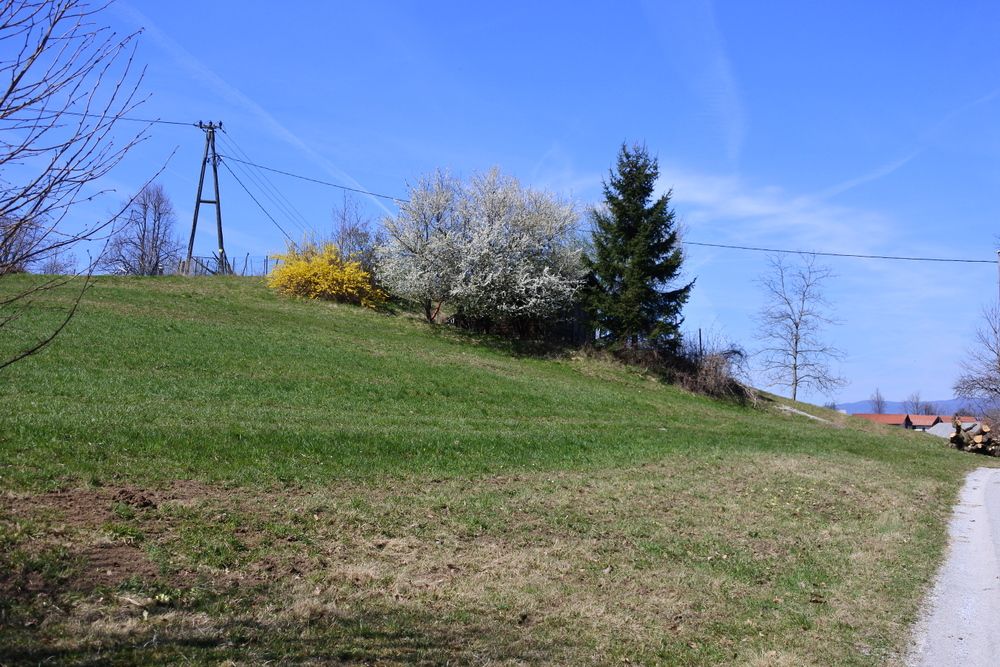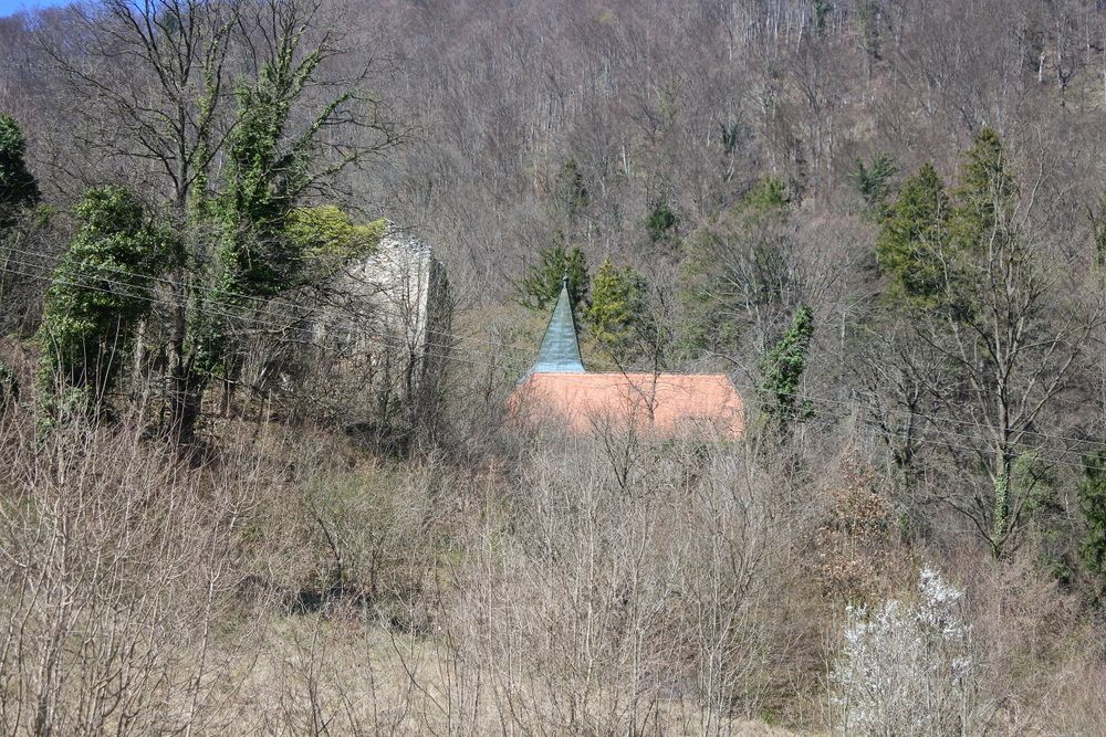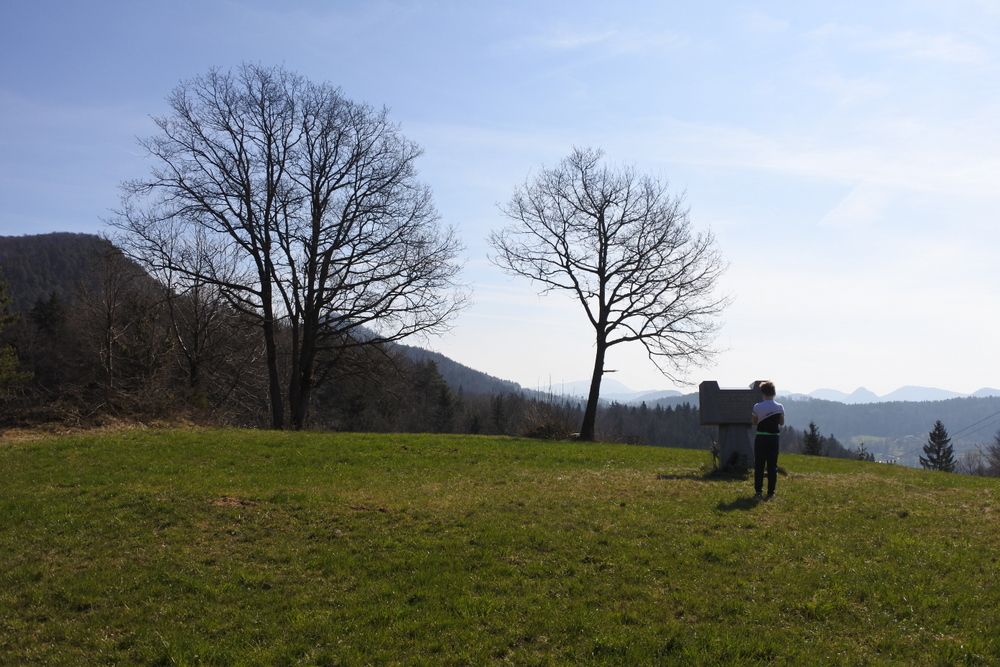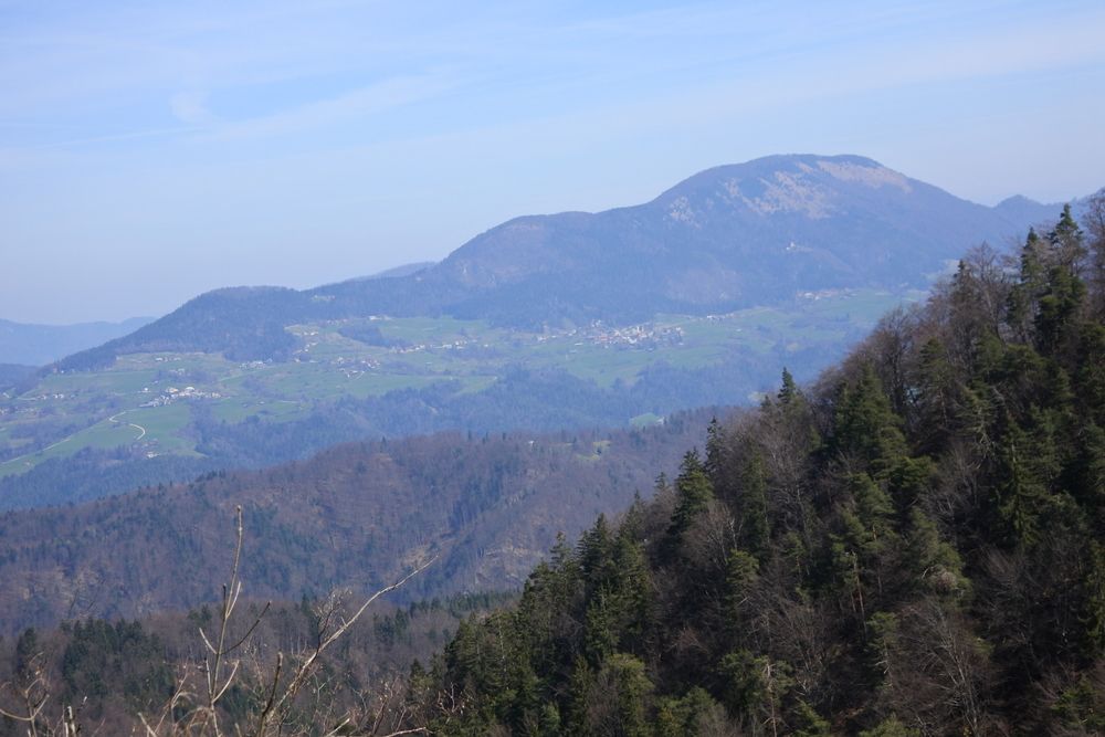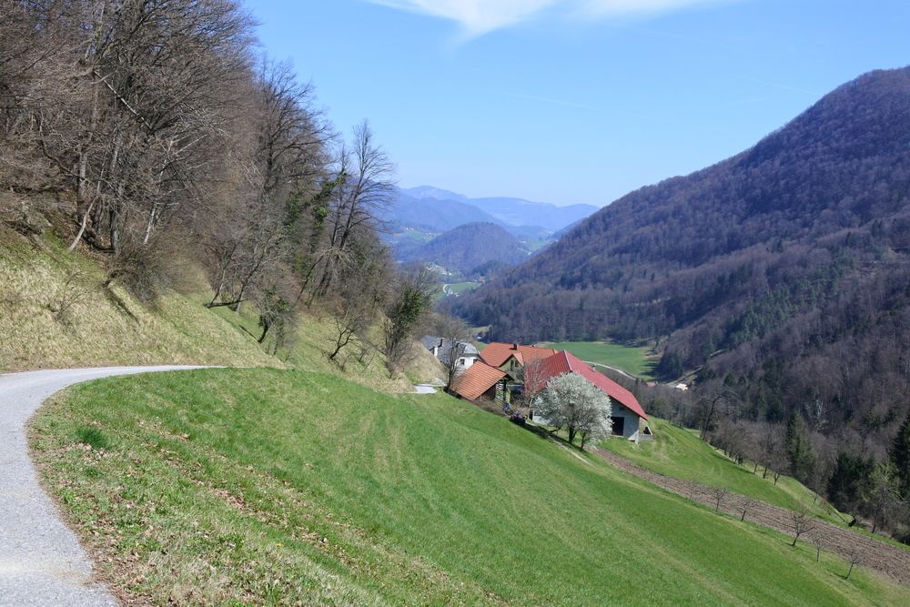 Desno nad nami se je odpiral lep pogled na cerkev, ki smo jo obhodili po krožni poti. Viri navajajo, da je tukaj že v 13. stoletju stalo pogansko svetišče, kasneje pa so na tem mestu 1753 leta sezidali to romarsko Marijino cerkev. Na vse strani so se nam odpirali pogledi na bližja pobočja, v daljavi pa na Kamniško-Savinjske Alpe.