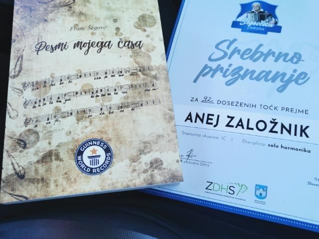 Po uspehih na mednarodnem tekmovanju za nagrado Avsenik, kjer je osvojil zlato ter na tekmovanju v Slovenj Gradcu, kjer je postal državni podprvak, se je minulo soboto, 11. junija, udeležil glasbenega dogodka v poklon ustvarjalcu Francu Šegovcu in legendarnemu, najstarejšemu ansamblu v Sloveniji ŠTIRJE KOVAČI.  Zveza diatonične harmonike Slovenije je tokrat prvič podelila Šegovčevo plaketo, Anej pa je v konkurenci harmonikarjev, ki so segali tudi že po priznanjih svetovnih prvakov, osvojil Srebrno priznanje.
