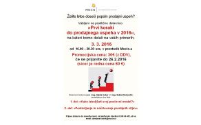 Vabljeni na praktično delavnico »Prvi koraki do prodajnega uspeha v 2016«, na kateri bomo delali na vaših primerih. Delavnica bo potekala 3. 3. 2016 od 16.00 - 20.30 ure, v prostorih Mocis-a