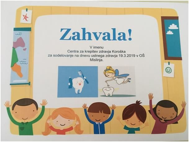 V okviru Svetovnega dneva ustnega zdravja smo za učence prve trijade OŠ Mislinja, dne 19. 3. 2019 od 8.20 – 11.05 pripravili poučne delavnice. Na dogodku so otrokom zobozdravnica, ter diplomirane medicinske sestre v sodelovanju z dijaki Srednje zdravstvene šole predstavile pravilno tehniko umivanja zob, zdravo prehrano za zdrave zobe in dlesni, nitkanje zob in ukrepe ob poškodbah zob. Dan je potekal sproščeno, poučno, plesno zabavno.