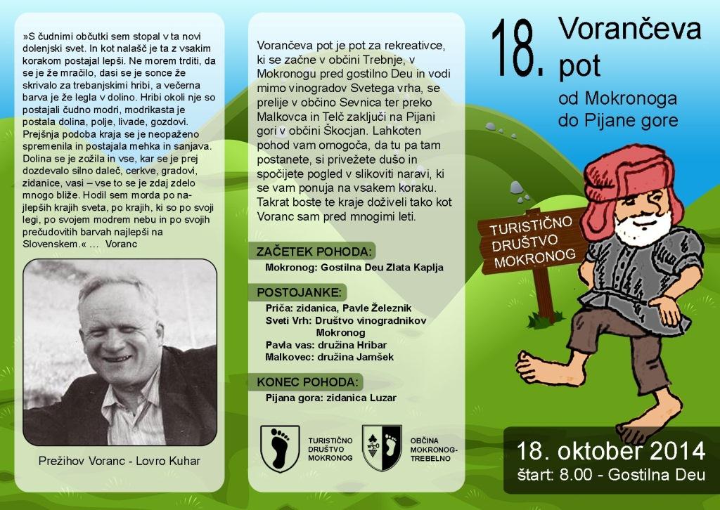 Jesen nam da paleto toplih barv, ki se razlivajo po naravi. Po vinogradih se oglašajo še zadnji brentači in klopotci, ki preganjajo vsiljivce na grozdih. In takrat je tudi Vorančeva pot od Mokronoga do Pijane gore, tretjo soboto v oktobru, tokrat 18. 10. 2014.