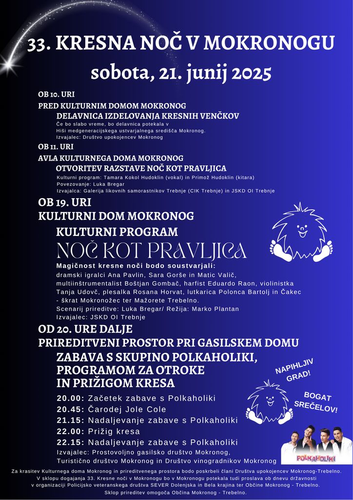 Ob kresni noči bo znova zaživel tudi prireditveni prostor pri gasilskem domu Mokronog, kjer so organizatorji od 20. ure dalje zasnovali pester zabavni program. Za najmlajše pripravljajo napihljiv grad, zabaval jih bo tudi čarodej Jole Cole. Seveda bodo v Mokronogu prižgali tudi kres, manjkal ne bo niti srečelov, za večerno zabavo pa bo skrbela skupina Polkaholiki.