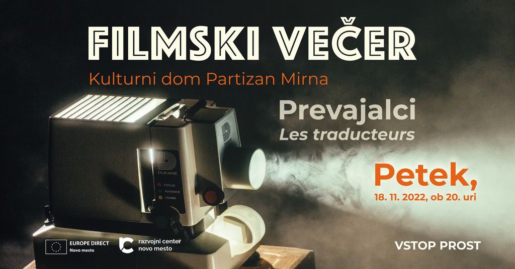 Pridruži se nam v petek, 18. 11. 2022, ob 20. uri v Kulturnem domu Partizan Mirna, kjer si bomo skupaj ogledali francoski film Prevajalci / Les traducteurs - https://www.imdb.com/title/tt6270534/.